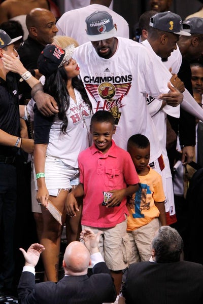 MIAMI, FL – JUNE 21: LeBron James #6 of the Miami Heat celebrates his wife Savannah Brinson and family after they Heat won 121-106 against the Oklahoma City Thunder in Game Five of the 2012 NBA Finals on June 21, 2012 at American Airlines Arena in Miami, Florida. NOTE TO USER: User expressly acknowledges and agrees that, by downloading and or using this photograph, User is consenting to the terms and conditions of the Getty Images License Agreement. (Photo by Mike Ehrmann/Getty Images)