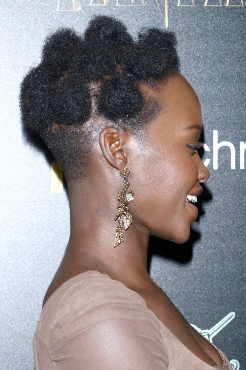 NEW YORK, NY – FEBRUARY 13: Actress Lupita Nyong’o, hair detail, attends the screening of Marvel Studios’ “Black Panther” hosted by The Cinema Society with Ravage Wines and Synchrony at Museum of Modern Art on February 13, 2018 in New York City. (Photo by Jim Spellman/WireImage)