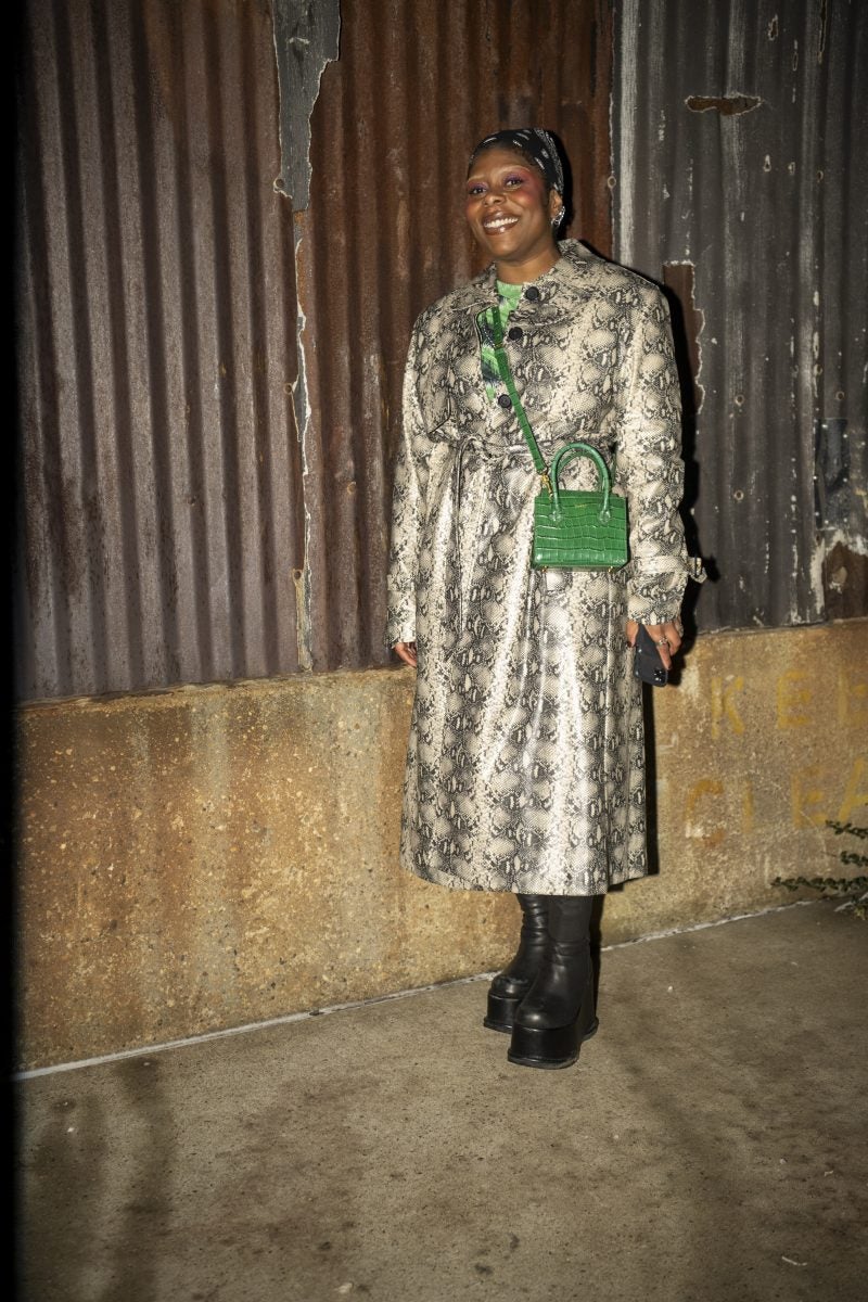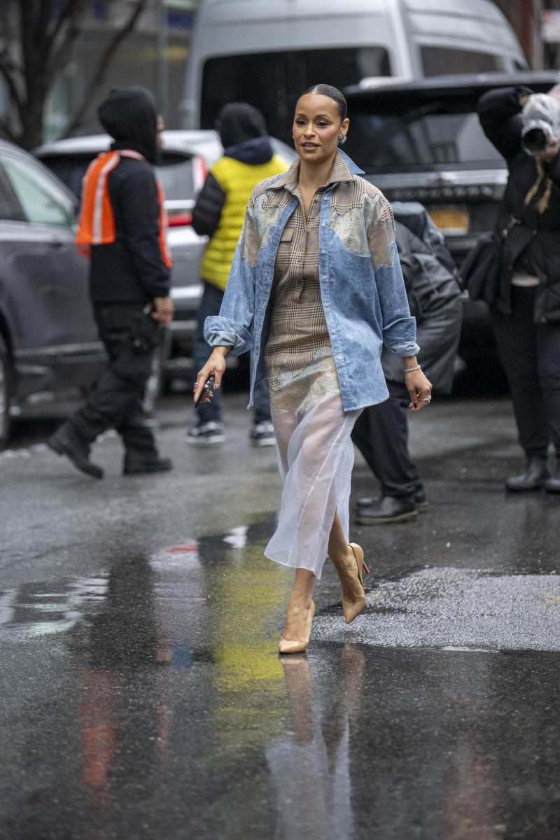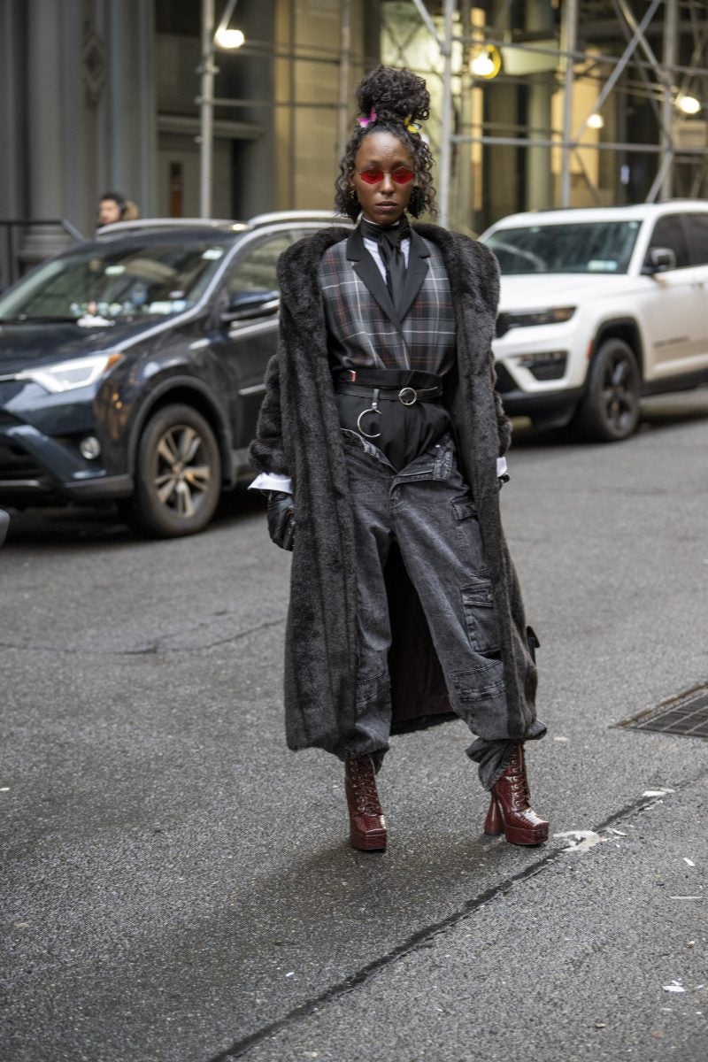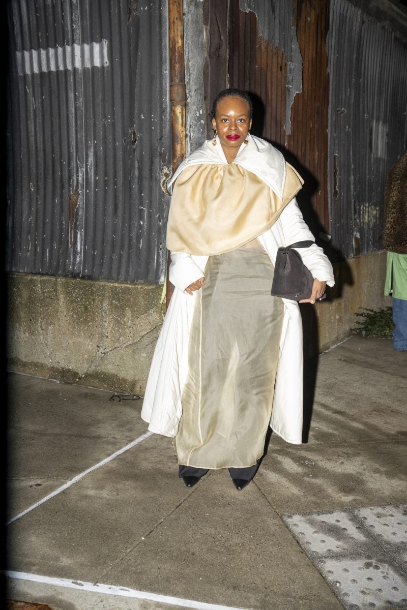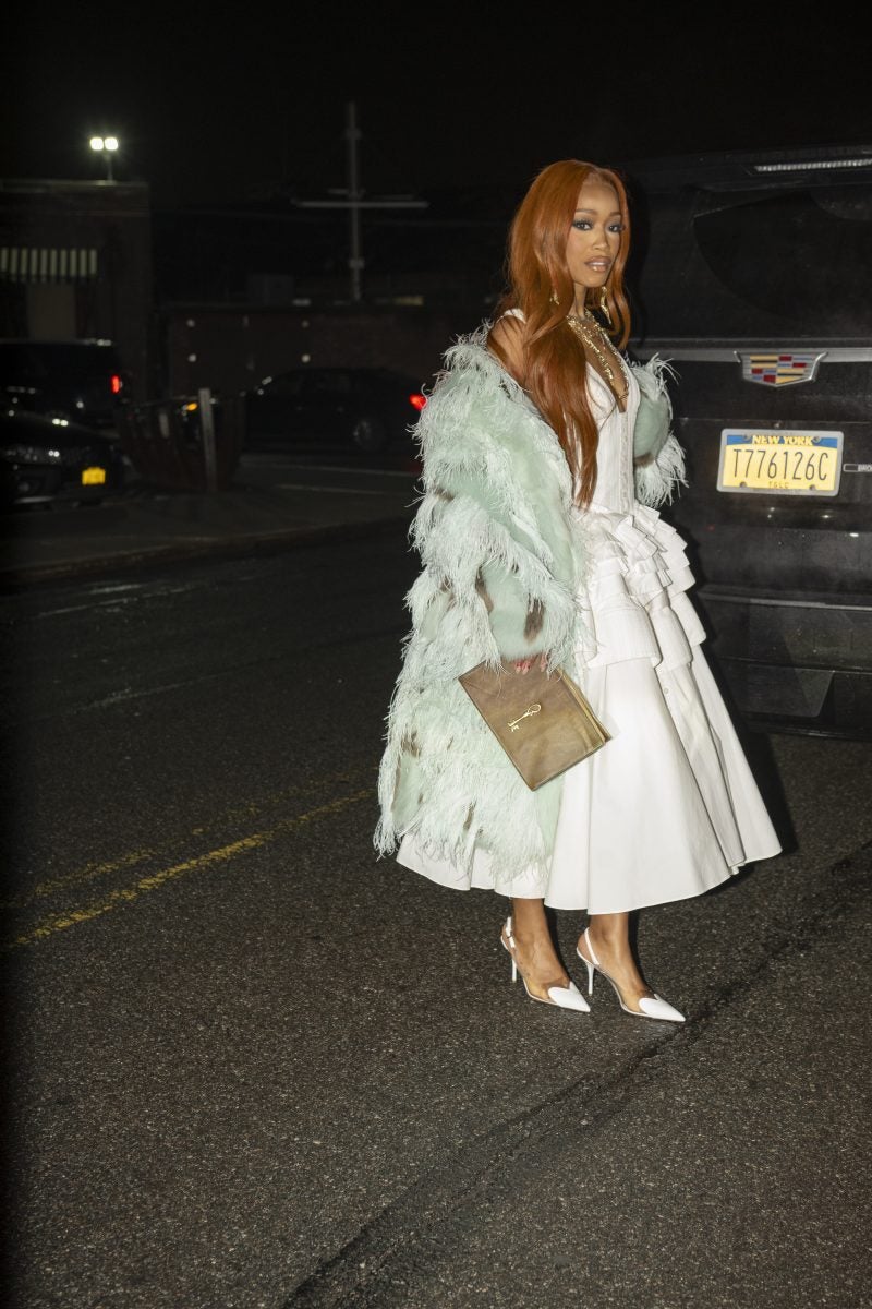 Actress and entrepreneur Keke Palmer was a frequently seen face on day one, beginning her day at Brandon Maxwell and ending it at CJR. Her commitment to supporting Black designers is undeniable. When we ran into Palmer, she was dressed in a mint feather coat, a white dress with an A-line skirt, and semi-transparent pumps from Alaïa, accessorized with a layering of gold chains and a burnt yellow clutch. Gallerist Hannah Traore was spotted in a Jane Wade knit gown featuring a voluminous hood, a backless design with a black thong peeking, a shawl, and a flowing train that trailed behind her as she darted from show to show.