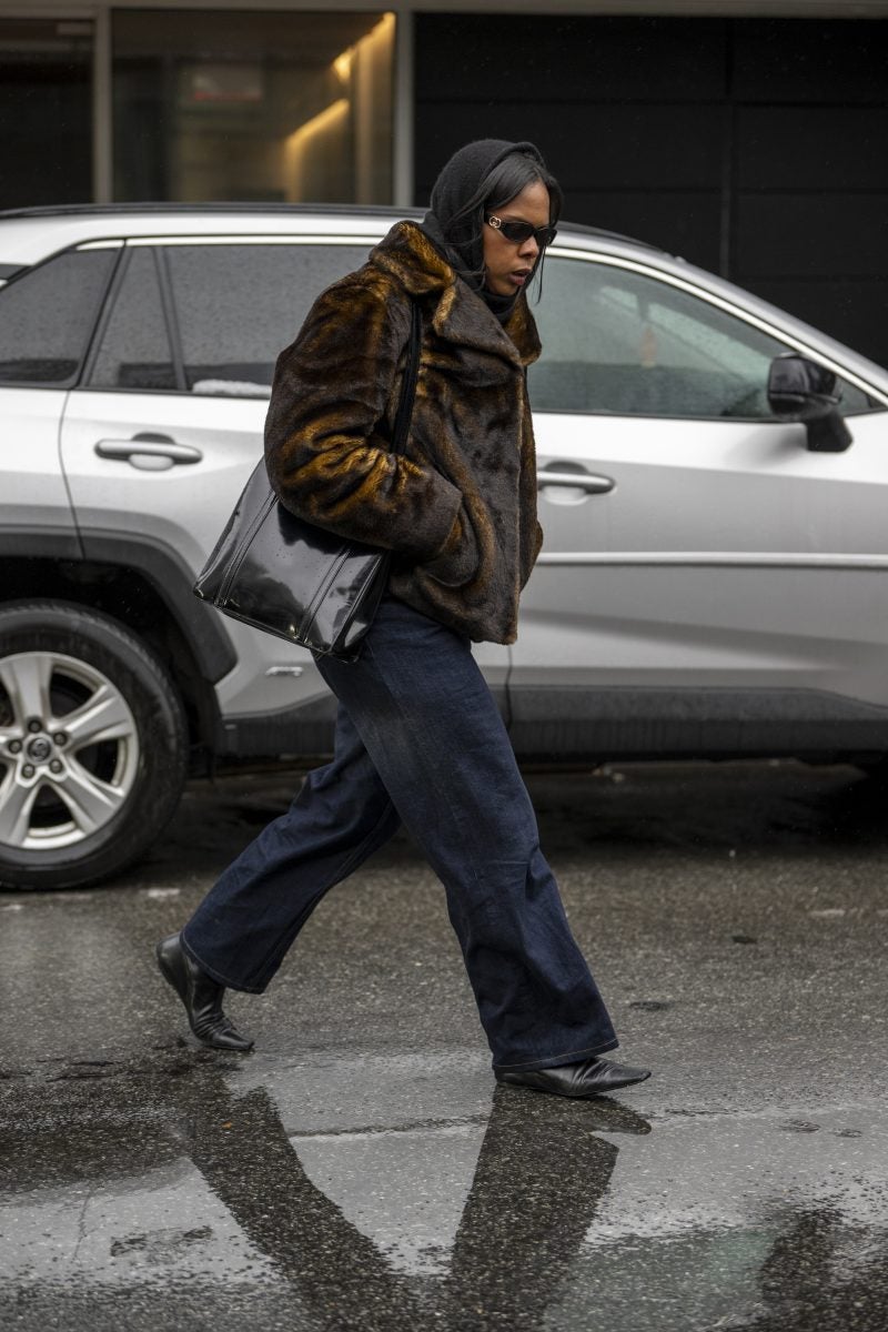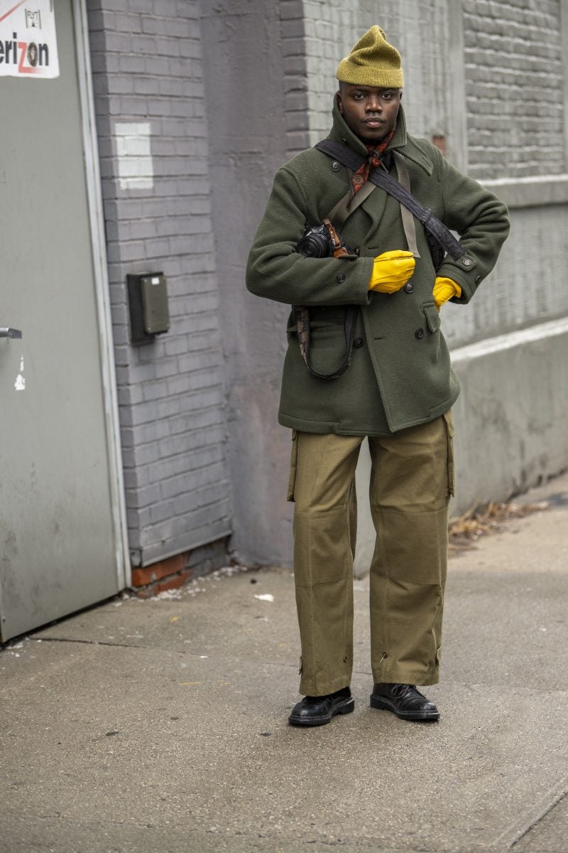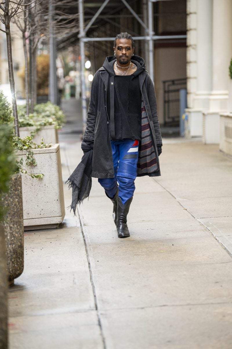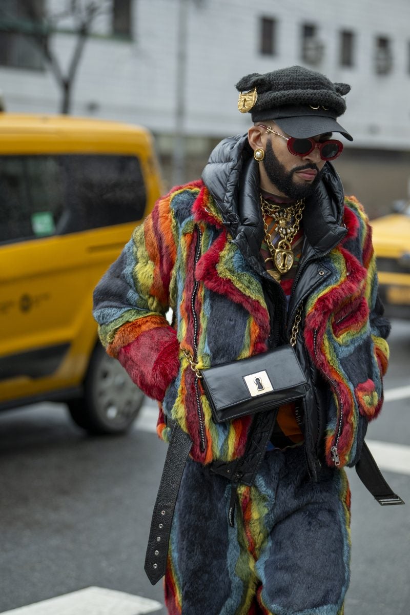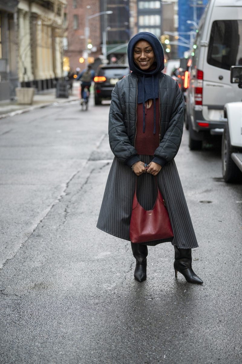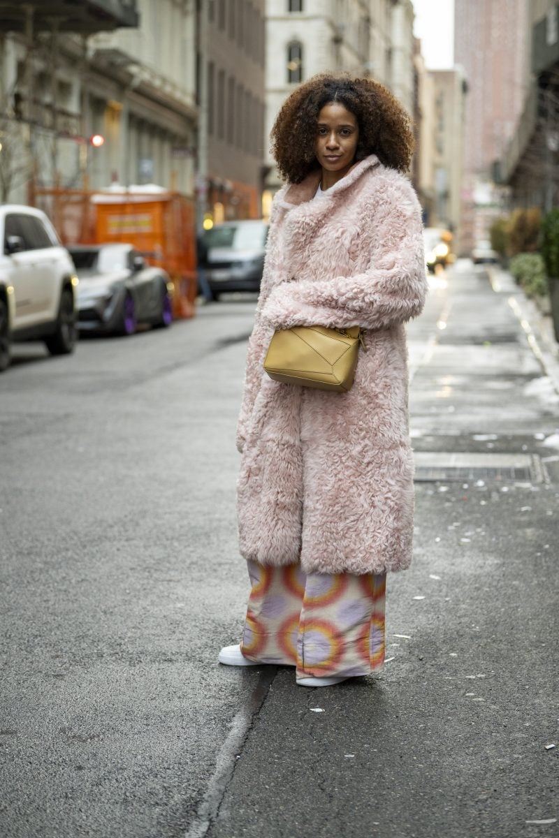 Actress and entrepreneur Keke Palmer was a frequently seen face on day one, beginning her day at Brandon Maxwell and ending it at CJR. Her commitment to supporting Black designers is undeniable. When we ran into Palmer, she was dressed in a mint feather coat, a white dress with an A-line skirt, and semi-transparent pumps from Alaïa, accessorized with a layering of gold chains and a burnt yellow clutch. Gallerist Hannah Traore was spotted in a Jane Wade knit gown featuring a voluminous hood, a backless design with a black thong peeking, a shawl, and a flowing train that trailed behind her as she darted from show to show.