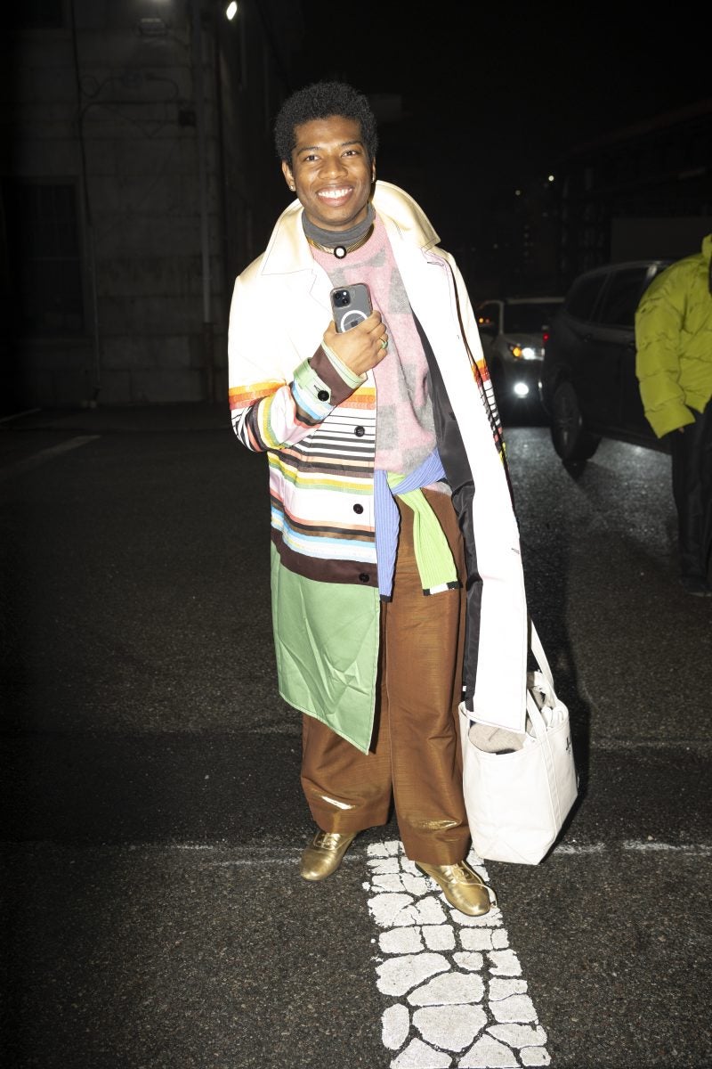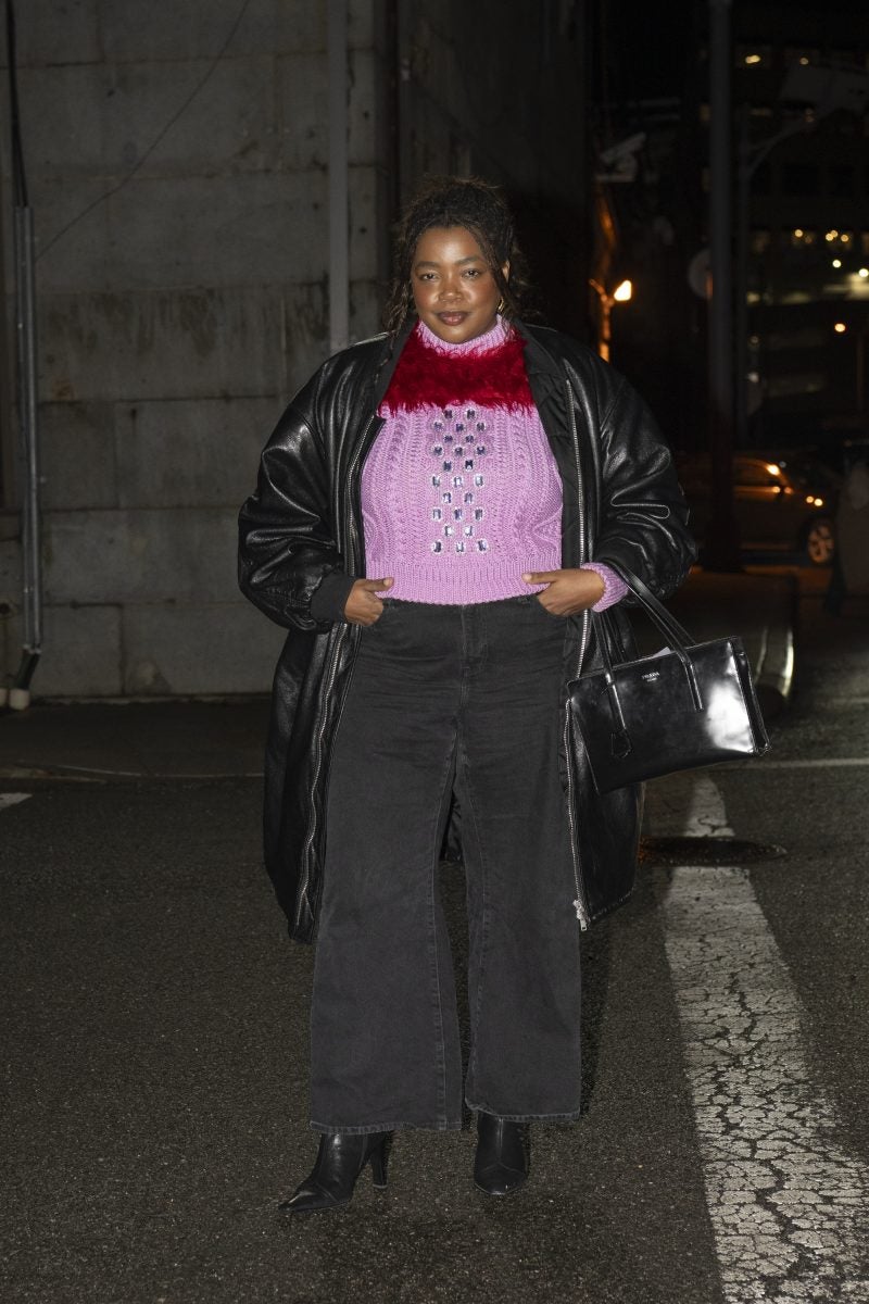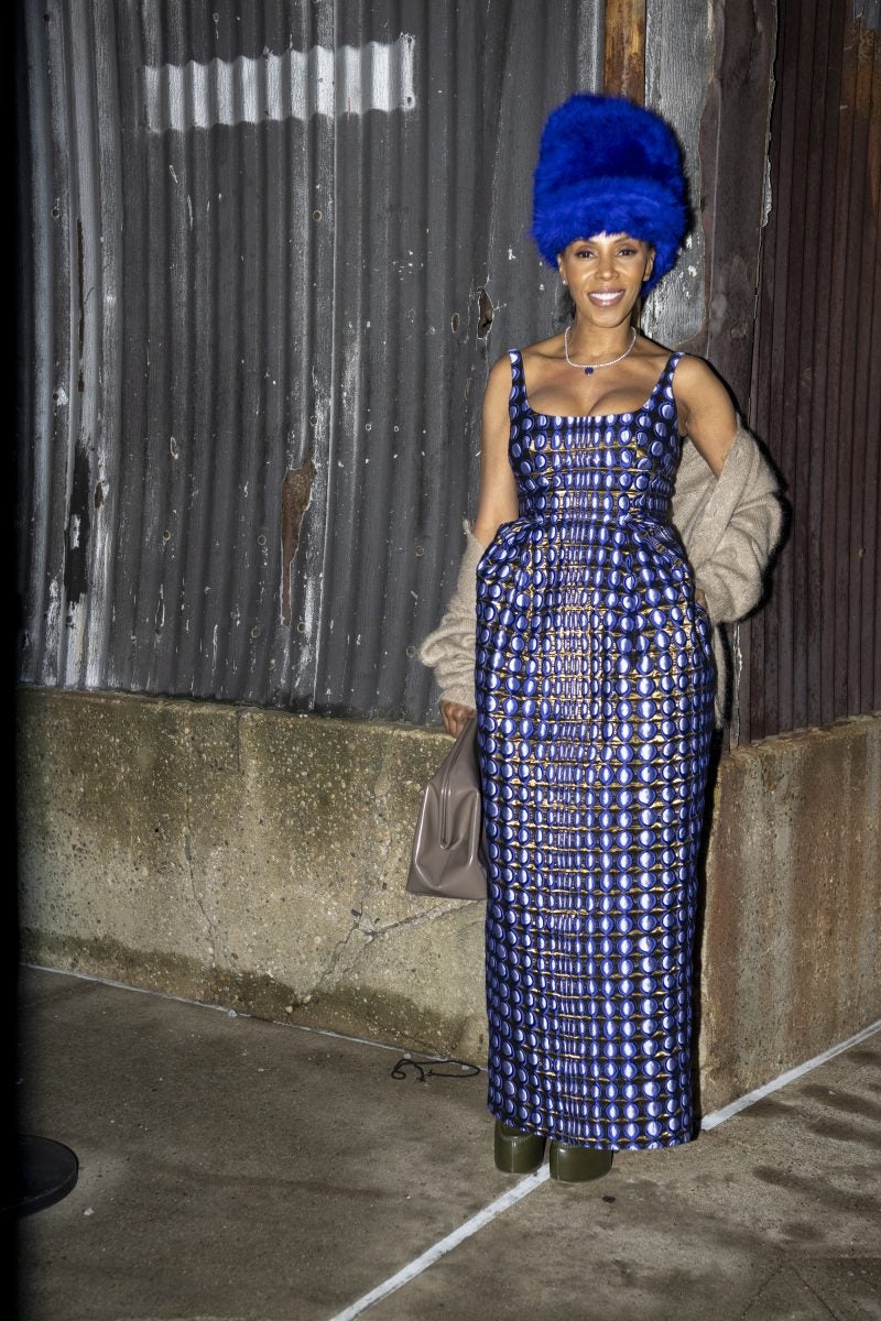 Following a two-year hiatus, people were eager to see what Christopher John Rodgers would show at his first collection back on the runway. Stylist and costume designer June Ambrose made a statement with her outfit, featuring an ankle-length dress adorned with blue dots in a geometric pattern, highlighted by yellow scratches woven throughout the design. True to her signature style, she completed the look with a towering hat and platform shoes. Style extraordinaire Gabriella Kareefa-Johnson also attended the show in a pink cable-knit sweater, embellished with silver jewels at the center and featuring a red fur trim along the neckline. She layered the look with a black leather trench for warmth, paired with black jeans, boots, and a sleek black Prada bag, allowing the sweater to be the focal point of the outfit.