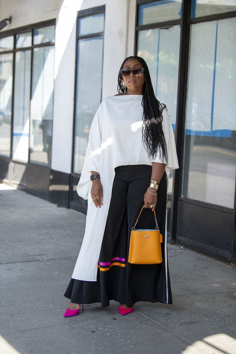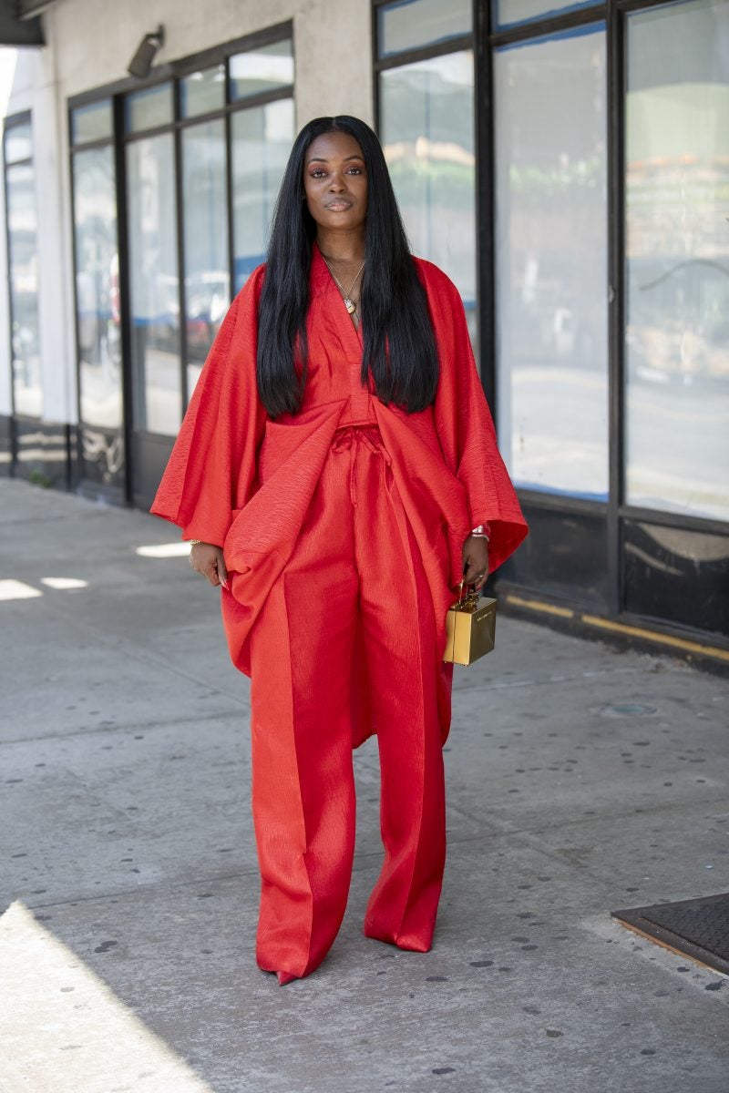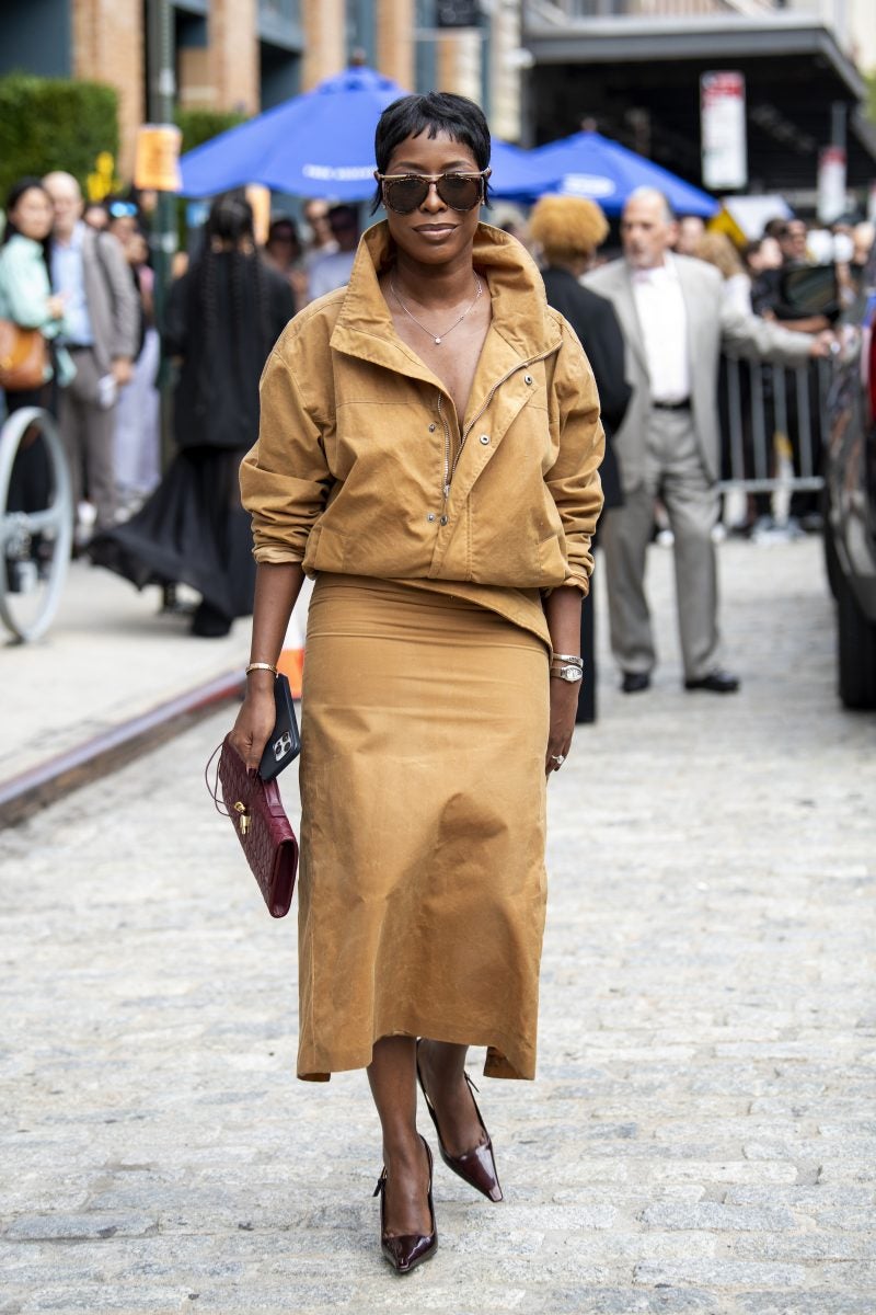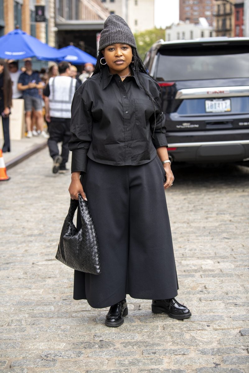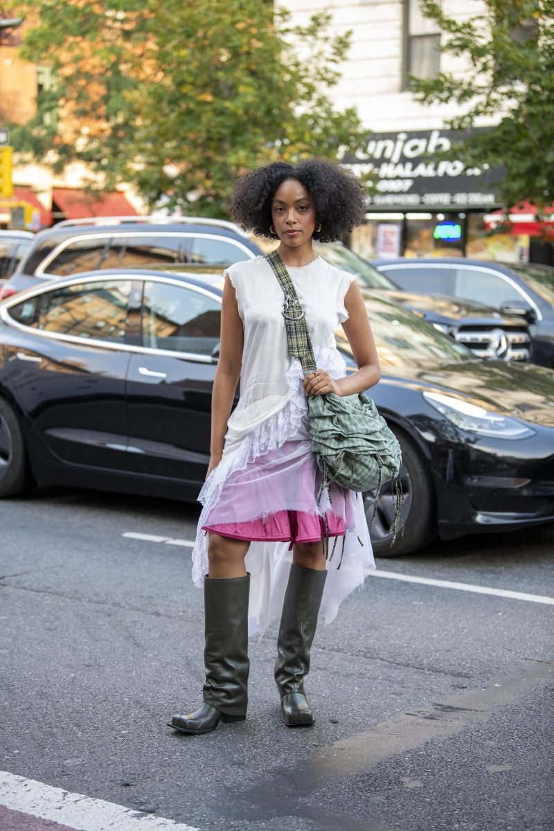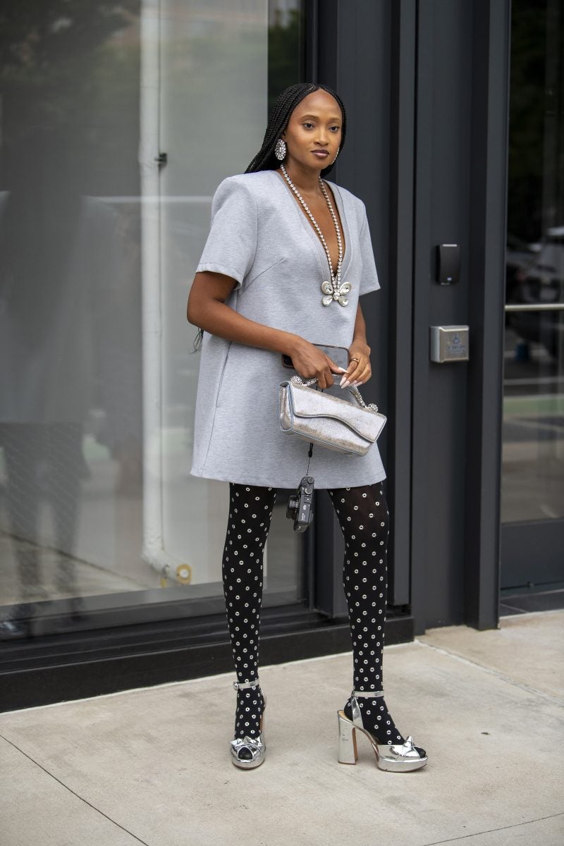 Editors and stylists alike came into the week with comfort meets chic in mind as they run to and fro between New York City and Brooklyn to catch a fashion presentation. Kia Goosby kept it straight officecore with a grey blazer layered over her blue flowy dress while Naomi Elizée opted for an edgier look with knee-high leather boots paired with a camo-printed mini skirt and a basic white T-shirt. Another attendee Kaylesse Anthony had a similar idea with her knee-high boots, white top, and girlish pink skirt.