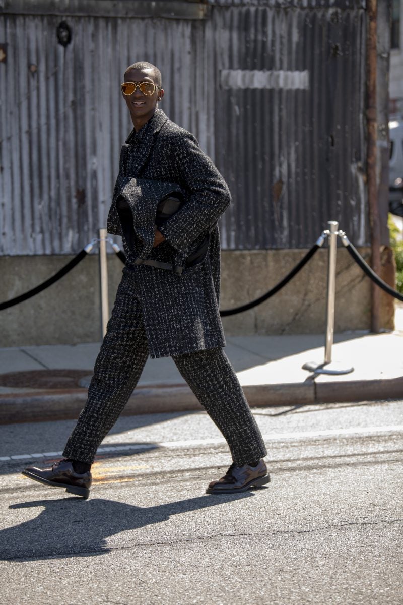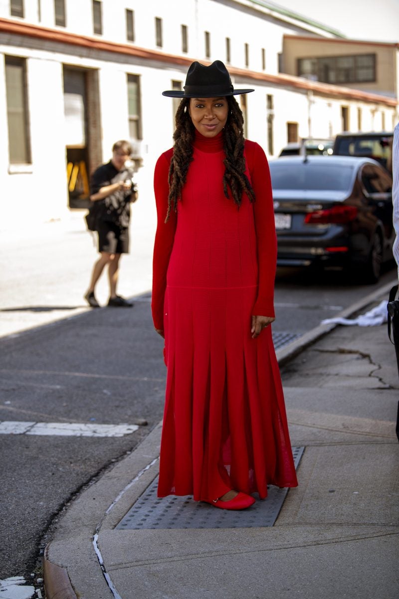 At COS, fashion creative Tamu McPherson wore a pop of red in her light knit, quarter-sleeve cutout top with a pair of sleek black pants. She accessorized with a puffy leather clutch and black cat-eye sunglasses. Colman Domingo attended the show wearing a monochromatic army green look. He added layering to elevate his simple look. Influencer Karen Blanchard wore a fiery red knit dress with a long-sleeved turtleneck layered underneath. She added a wide-brim hat, red flats, and a textured handbag to her outfit.