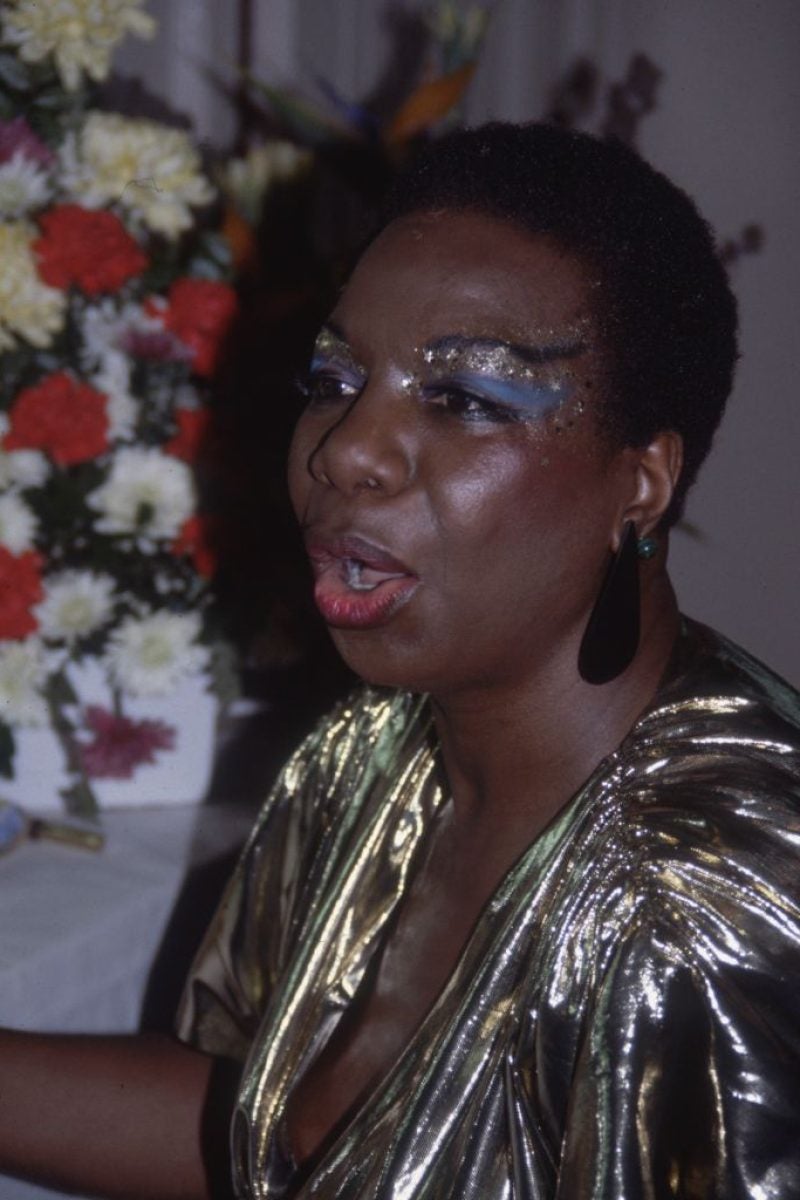 Fast forward to 1975, Simone graced the stage at a concert with a head turning beauty moment: blue eyeliner and eyeshadow, deep brown highlighter, and her signature red lip. Even in the final years of her life, her beauty choices remained as captivating as ever. At the Rainforest Foundation’s 11th Annual Carnegie Hall Benefit Concert after-party in New York City, for example, she wore a short pixie cut, paired with bold blue and gold eyeshadow and a deep burgundy lip—a testament to her fearless approach to beauty.