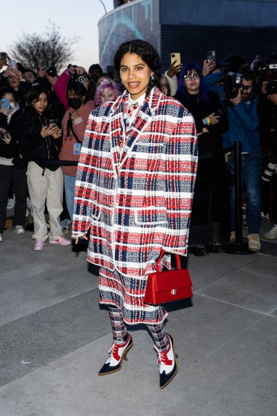 And while we’ve focused on one singular celeb for the look of the day, today we’re spotlighting the entire front row at Thom Browne. From Queen Latifah and Whoopi Goldberg to Lil Nas X (also seen at Coach and LaQuan Smith the previous day) and Yahya Abdul-Mateen II, all decked out in full Thom Browne, celebrity street style outside the show was on a whole other level. There was Pusha T in the brand’s signature shrunken short suit alongside Lil Nas X with his paisley embroidered dog bag. Thom devotees are loyal to the brand’s quirky take on tailoring, and the celebrity guests fell right in line.