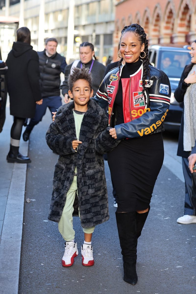 LONDON, ENGLAND – DECEMBER 11: Alicia Keys with her son leaving a performance on the piano at St Pancras International Station at Kings Cross on December 11, 2023 in London, England. (Photo by Neil Mockford/GC Images)