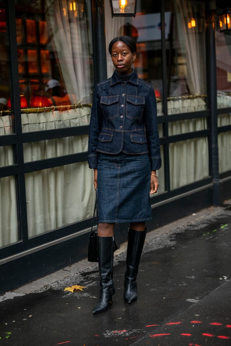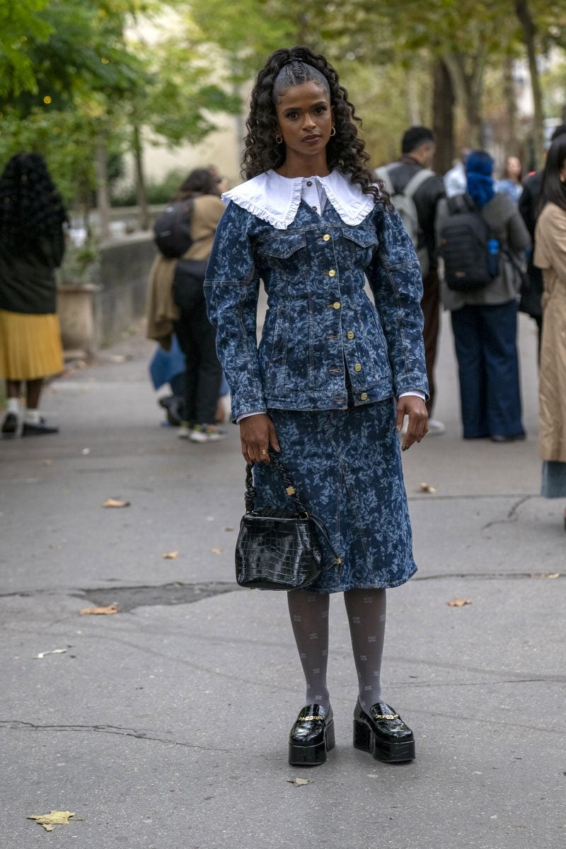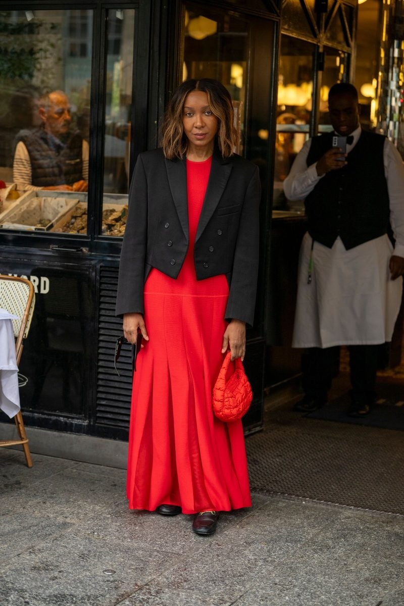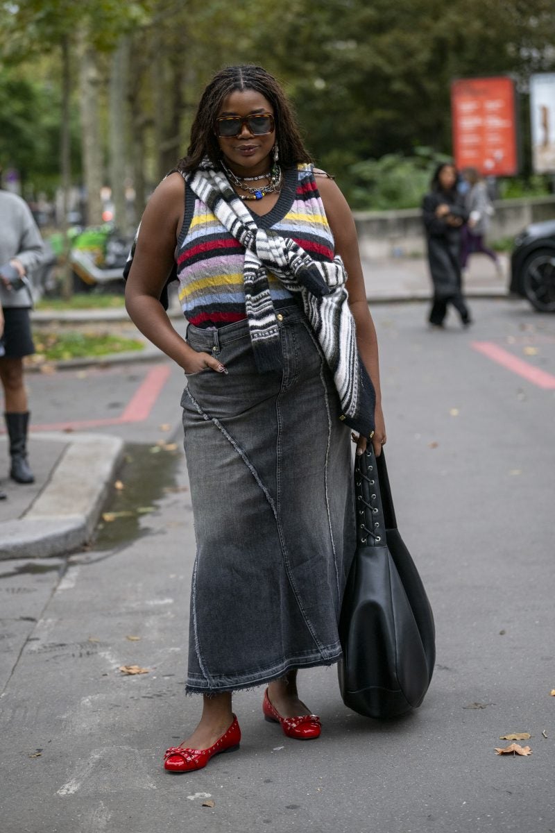 While some who were on the streets opted for cherry red coats or Canadian tuxedos, others looked to hues like grey to make a statement. In fact, one street style star wore an entirely grey set with a maroon wrap over leather bag plus a black leather hat. Another standout look? Karen Blanchard who donned a bright red dress with a plush bag to match and a black leather jacket. Next, we spotted Gabriella Karefa-Johnson in a grey denim skirt paired with a striped top in primary colors and red patent leather flats. This was a fun twist on early fall garbs.