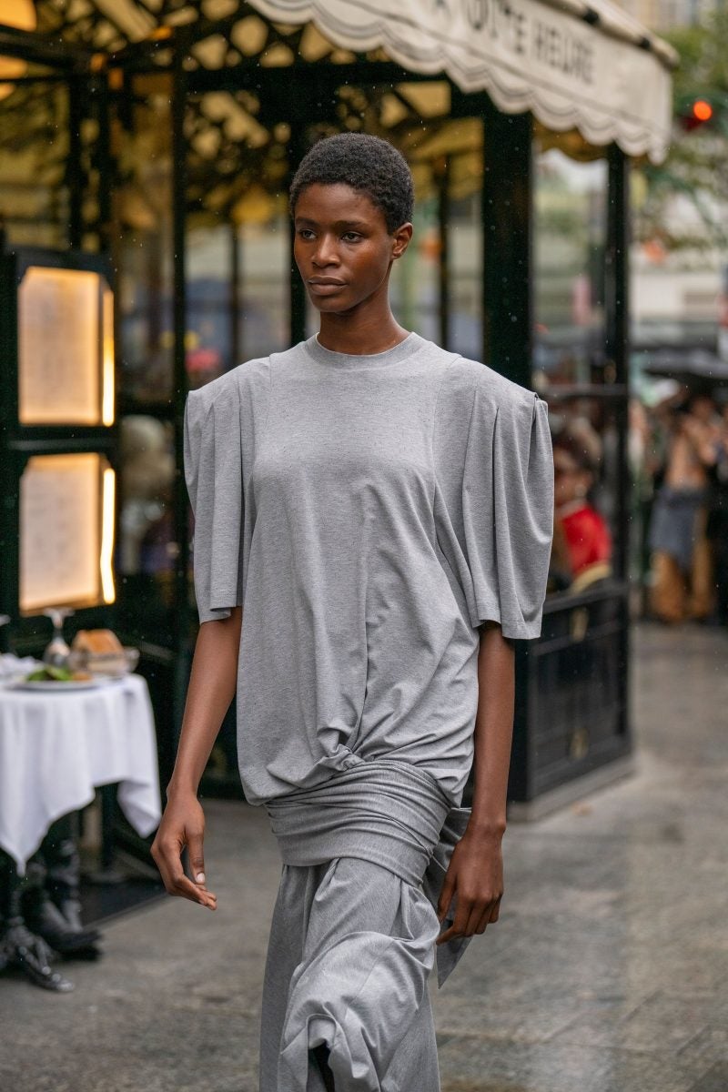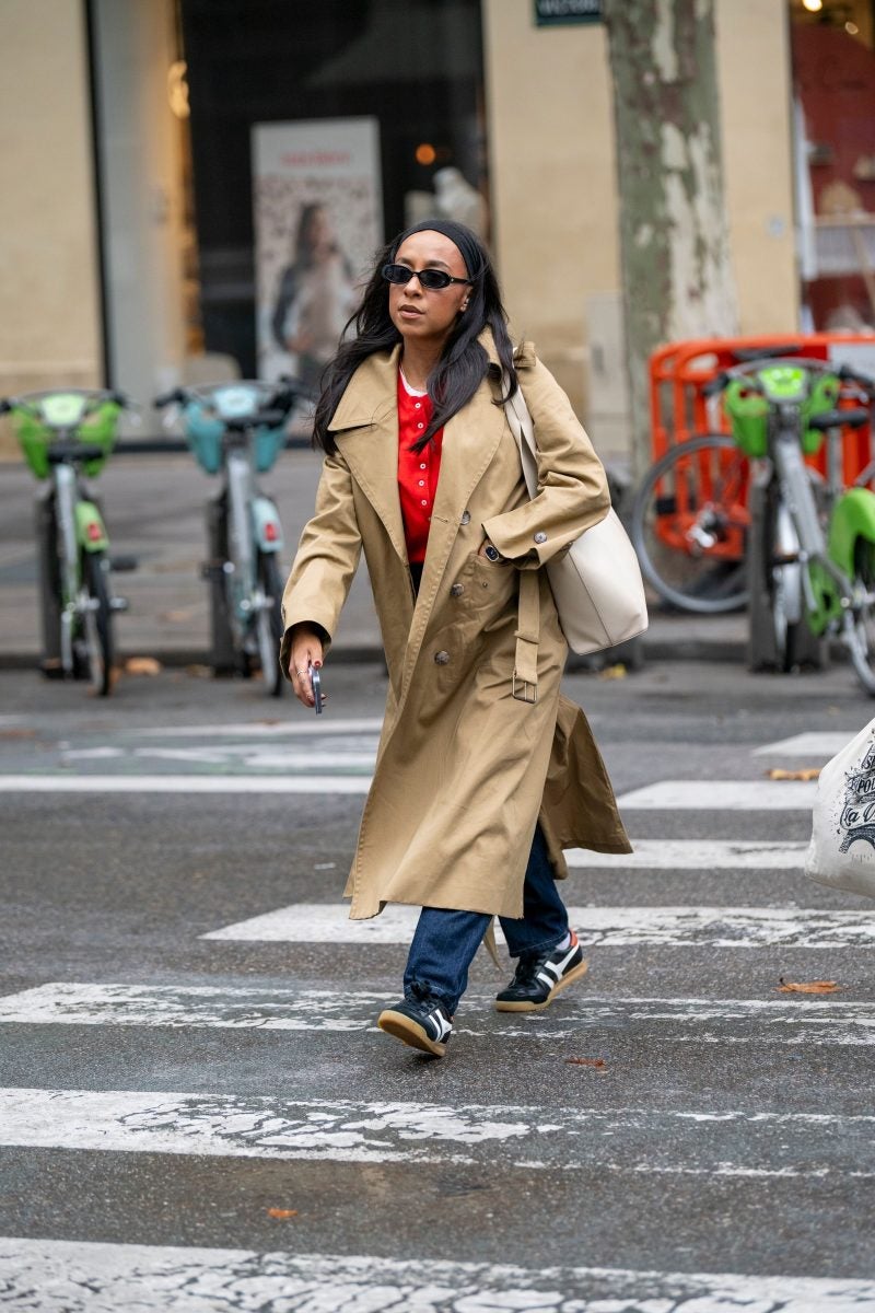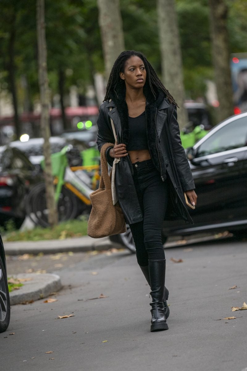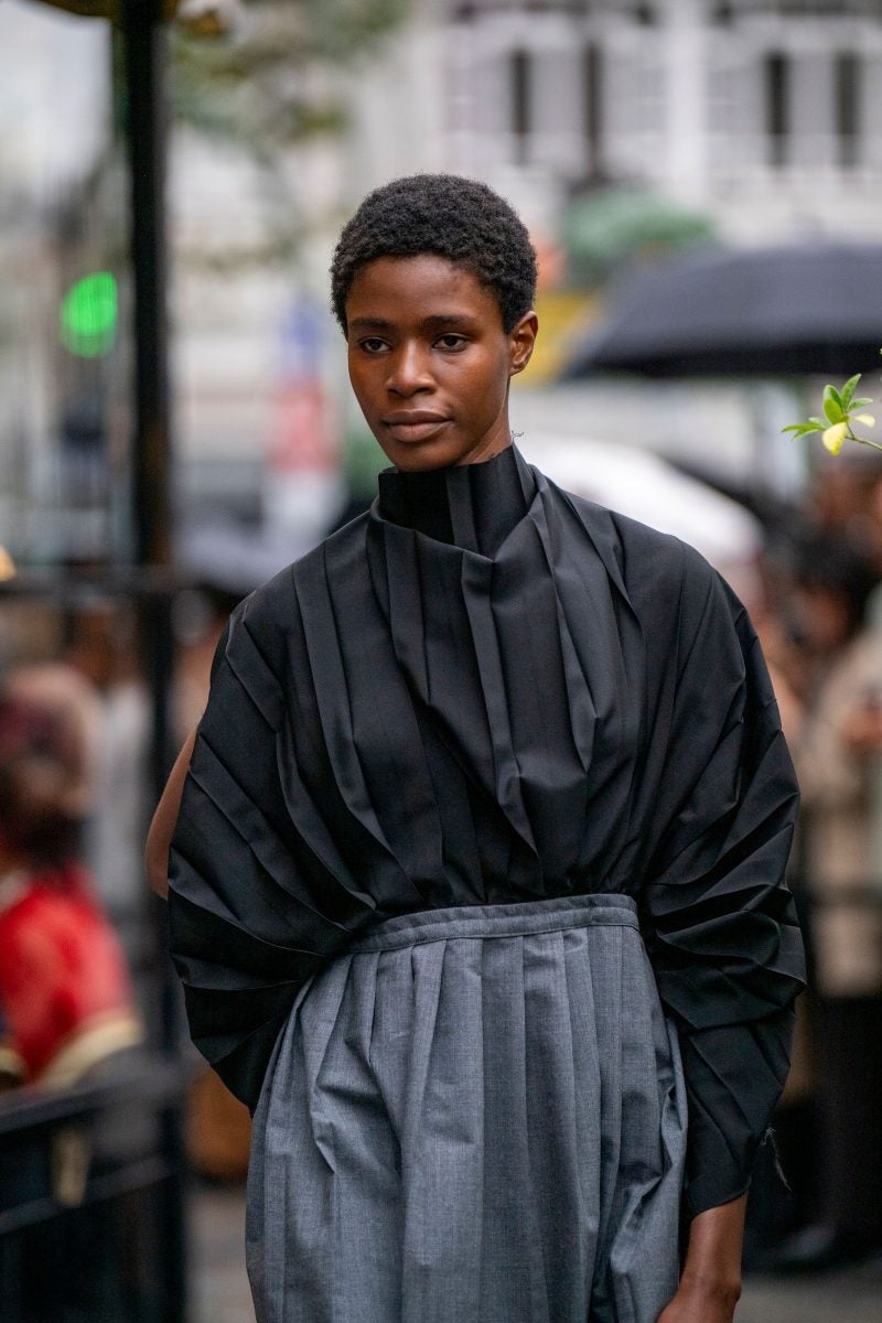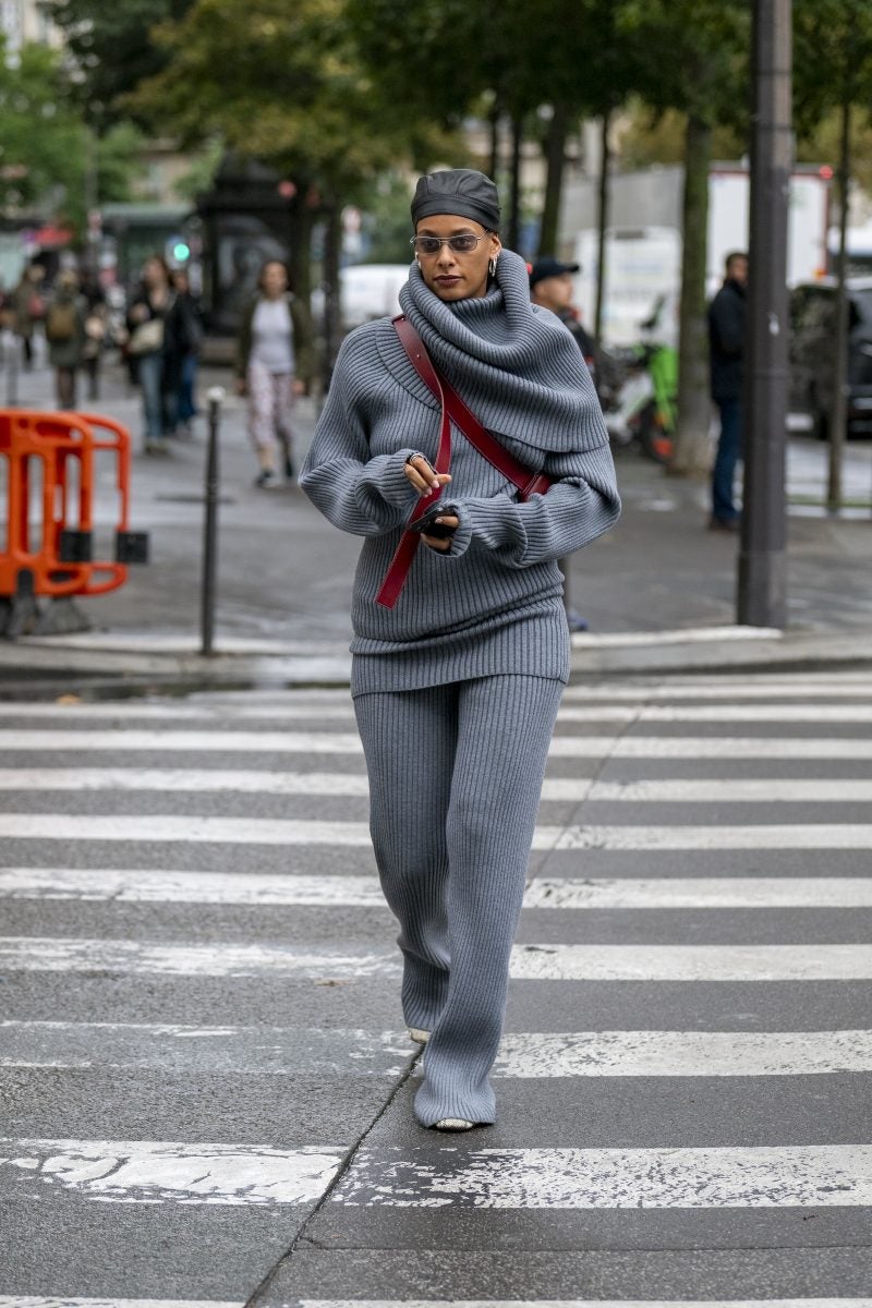 While some who were on the streets opted for cherry red coats or Canadian tuxedos, others looked to hues like grey to make a statement. In fact, one street style star wore an entirely grey set with a maroon wrap over leather bag plus a black leather hat. Another standout look? Karen Blanchard who donned a bright red dress with a plush bag to match and a black leather jacket. Next, we spotted Gabriella Karefa-Johnson in a grey denim skirt paired with a striped top in primary colors and red patent leather flats. This was a fun twist on early fall garbs.