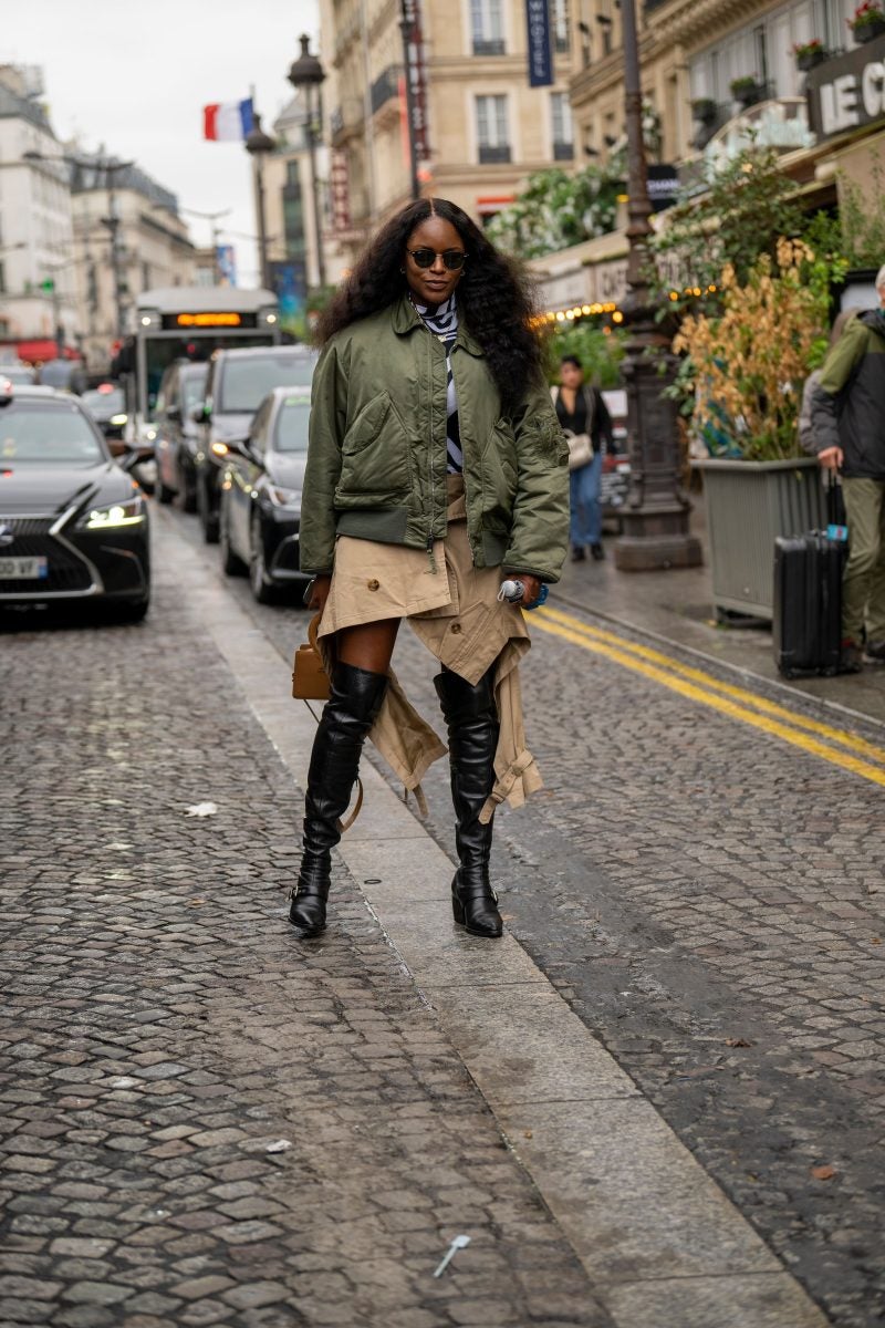 Need some pre-fall inspiration, this set of imagery has got that handled. An additional killer pairing included a military green jacket worn with a uniquely cut tan skirt and knee-high leather boots in black. Not your thing? Try an alternative look: a silver bomber (yes silver) with jeans emblazoned with the hue and brown square-toe boots. Don’t forget to add your oversized Chanel bag too.