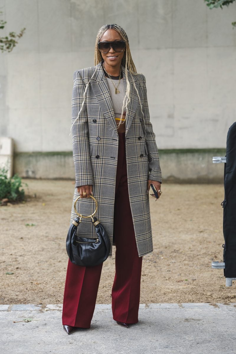Stylist and costume designer Shiona Turini turned up for shows in a lengthy plaid coat, a cream cropped top, and statement-making maroon trousers. Additional showgoers were into trousers with eccentric cut-outs, frocks in hues like bold deep red, and dark purple. A look seared into my brain includes a two-piece set consisting of an oversized top in tan with an ombre design emblazoned on it worn with matching trousers.