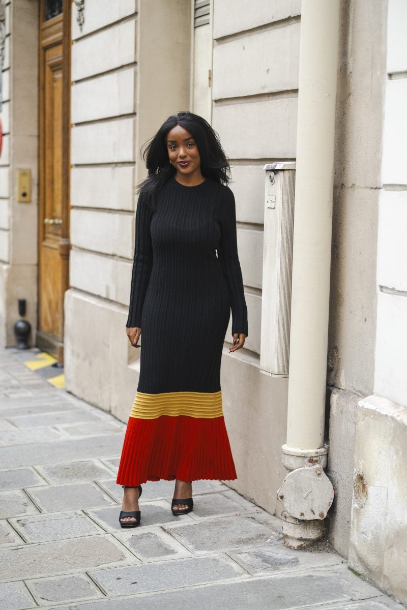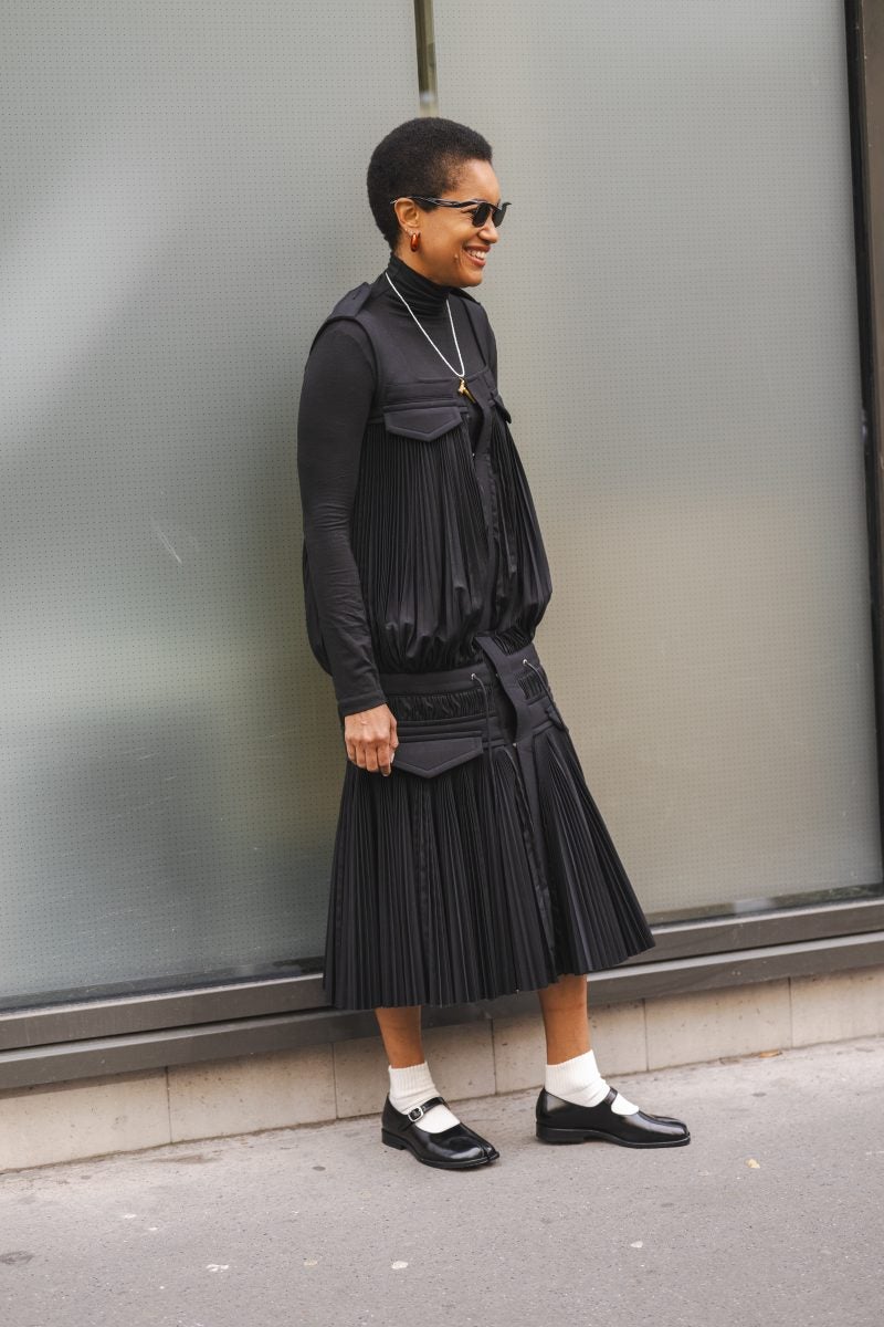 Captured by Seleen Saleh participants in the fashion extravaganza that encompasses PFW were led by their inner compass. That led them to variations that were appealing and somewhat colorful. One person, in particular, donned a vibrant orange cotton top with rows of pleating with a vinyl pair of bottoms. Stylist Becky Akinyode opted for a kitschy black sweater with a floral applique, matching tights, a head scarf, and Maison Margiela flats. The black bloomers she wore were on-trend for the looming resurgence of this style of bottoms.