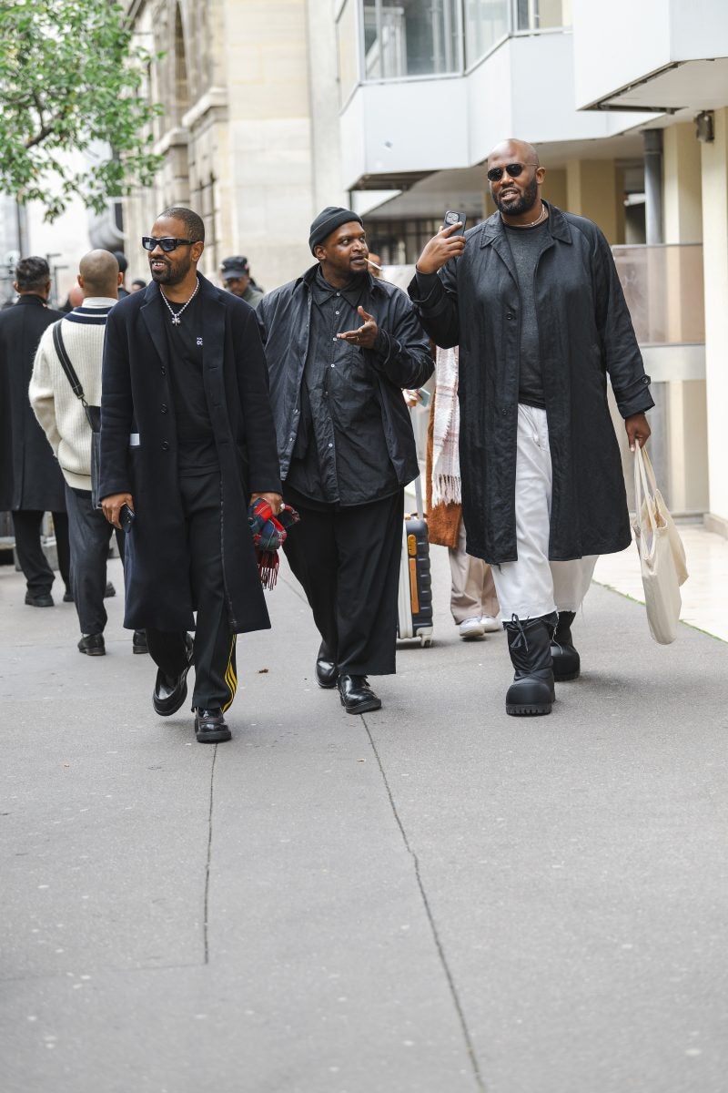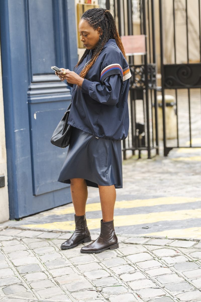 Street style peacocks were out to play on the latest day of Paris Fashion Week. In case you’re curious this monicker is placed upon those who take risks and are adventurous when they get dressed. As these individuals traveled between presentations their outfits took center stage. Camouflage separates, interesting layering, colorful sweaters, heavy leather boots, and utilitarian-inspired denim were worn by showgoers. Suiting also took precedence on this day as reflected in the ensemble worn by Ming Lee Simmons–she donned an excellent black, long-sleeved suit with matching trousers.