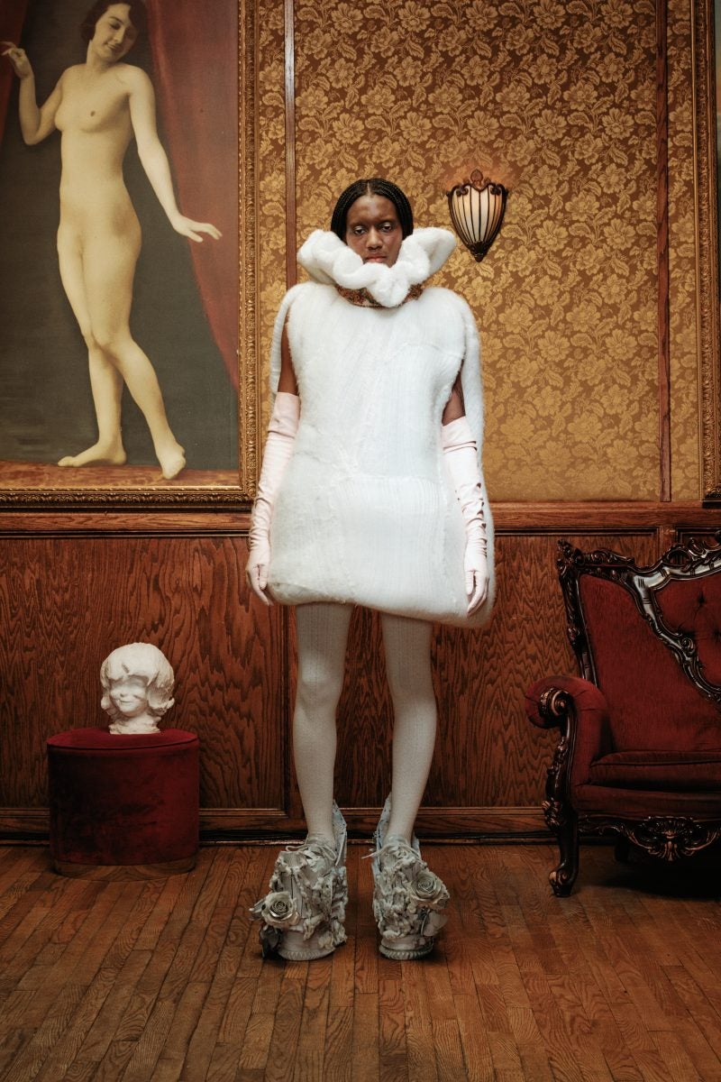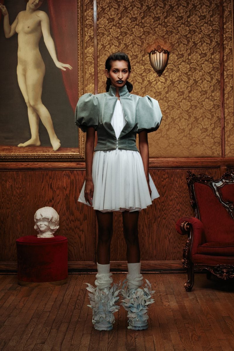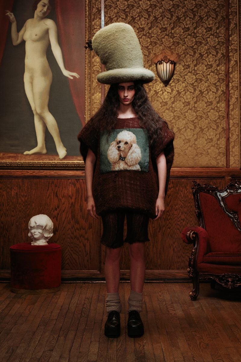 With 18 looks on the runway styled by Jody Bain, the story quickly came alive with intention. Oversized wool top hats, exaggerated shoulders, and structured peplum pieces were a part of the brand’s newest creations. The designer pulled additional inspiration from the dark aesthetics of the show Interview with the Vampire. Resilience in the face of entrapment and autonomy are balanced throughout the show with Bram Stoker’s novel Dracula and Romanian painter Corneliu Baba’s imagery in mind. Brushed wool, lace, coated materials, fuzzy draping allude Lorena’s sources of inspiration.