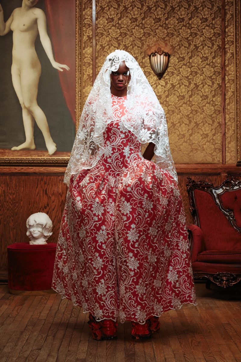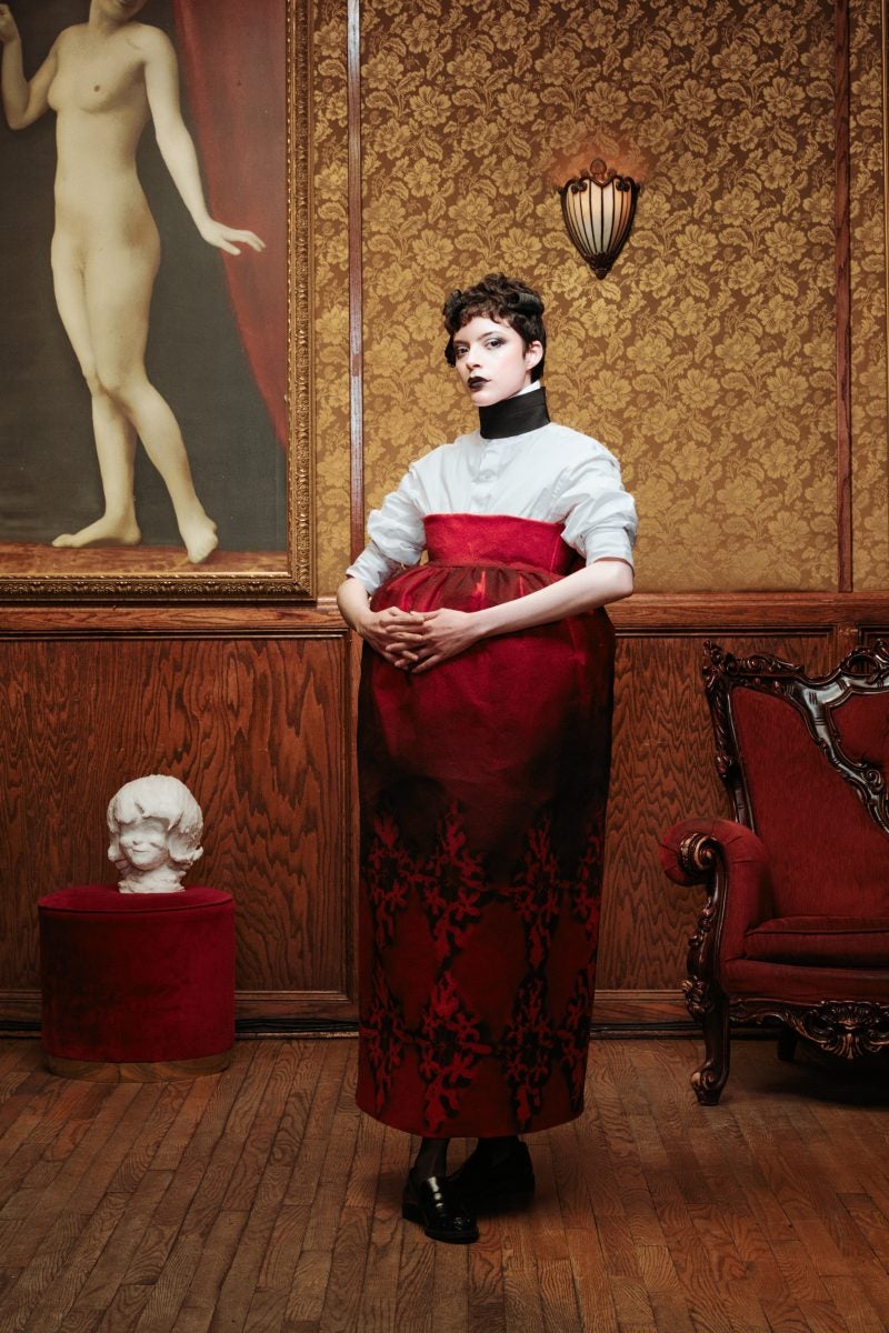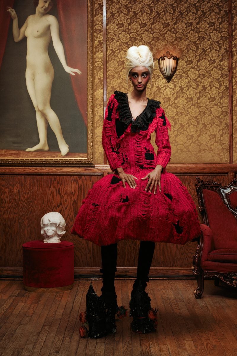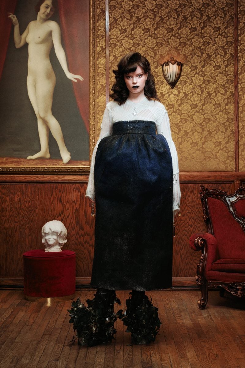 Not many accessories were needed as the ensembles spoke for themselves, however dramatic hats and a few veils were at play. The shoes at the show were just as eye-catching as the hats, so large that some models didn’t dare to walk down the stairs to the end of the runway but rather strutted right to the edge of the stairwell—maybe a nod to the storyline of Dracula’s muses not being able to escape.