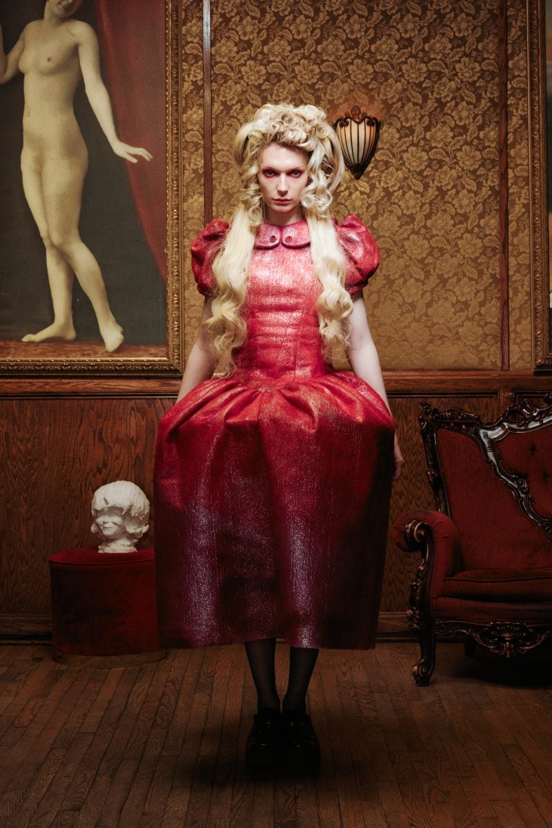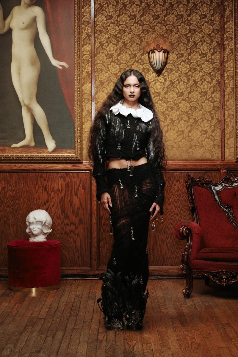 In the middle of Nolita, Lorena Pipenco’s Fall/Winter 2025 runway show is set in an underground speakeasy, The Back Room. Dimly lit by a cluster of tall wax candles, models began to descend the stairwell in fantastical garments that conveyed the Romanian story of Dracula. While the vampire may have had his female muses trapped in his wake, Pipenco reimagines them as autonomous beings.