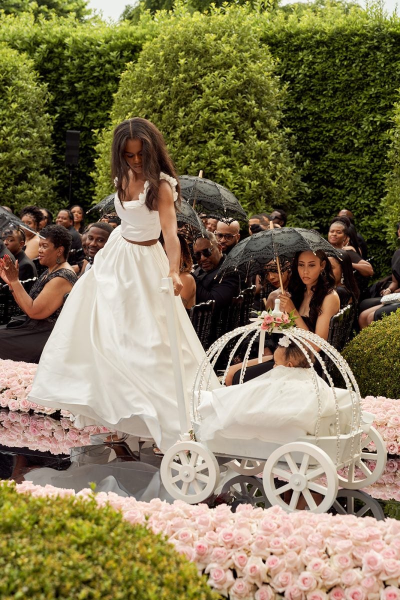 The end result was an absolutely gorgeous celebration, from the couple’s daughter, Leo, being brought down the aisle in a carriage by big sister Ryelle, pink roses of different shades leading to the altar, and crystals dripping from the ceiling for the reception. When it was time to party, there was an outfit change into a glittering mini-dress (Dolce, of course!), with performances from Miguel, Jeezy, and fireworks to cap off an unforgettable day.