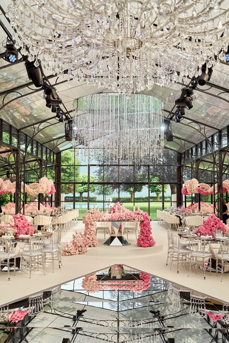 Diann’s doing, inside Villa Balbiano’s glass marquee, the room was filled with custom florals, a massive sparkling chandelier, and thousands of individual strands of Swarovski crystals hanging over the couple as they celebrated with guests at dinner.