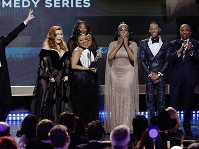 LOS ANGELES, CALIFORNIA – FEBRUARY 26: (L-R) Chris Perfetti, Lisa Ann Walter, Quinta Brunson, Janelle James, Sheryl Lee Ralph, Tyler James Williams and William Stanford Davis accept the Outstanding Performance by an Ensemble in a Comedy Series award for “Abbott Elementa” onstage during the 29th Annual Screen Actors Guild Awards at Fairmont Century Plaza on February 26, 2023 in Los Angeles, California. (Photo by Kevin Winter/Getty Images)