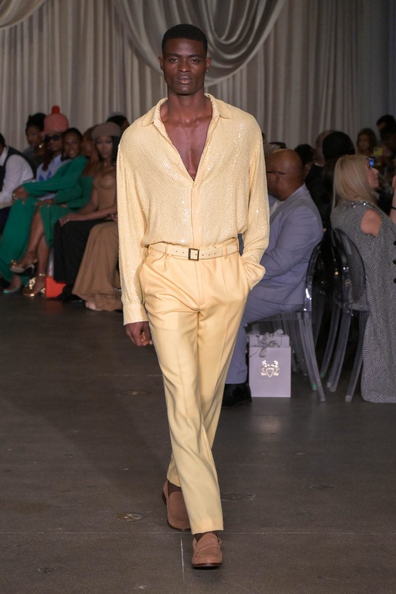 A light silken yellow mini dress with a sash on the back was another. Utilizing lilac yet again Sergio paired a silk pair of trousers in this tone with a sequin button-up a few shades lighter, this was contemporary. A color-blocked gown in black with a hit of baby pink also went down the runway. A large sash train followed the gown, an elegant addition.