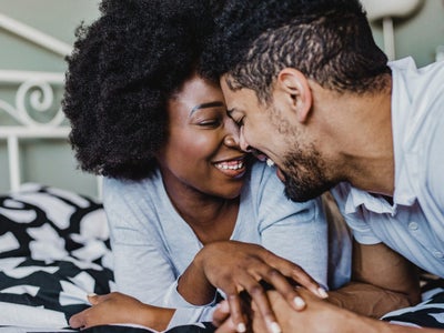 Photo of an attractive young couple lying on their bed close to one another, sharing fun conversation.