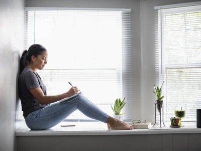 Woman sitting in widow seat writing in note book near houseplants, blue tooth speaker, book and eyeglasses