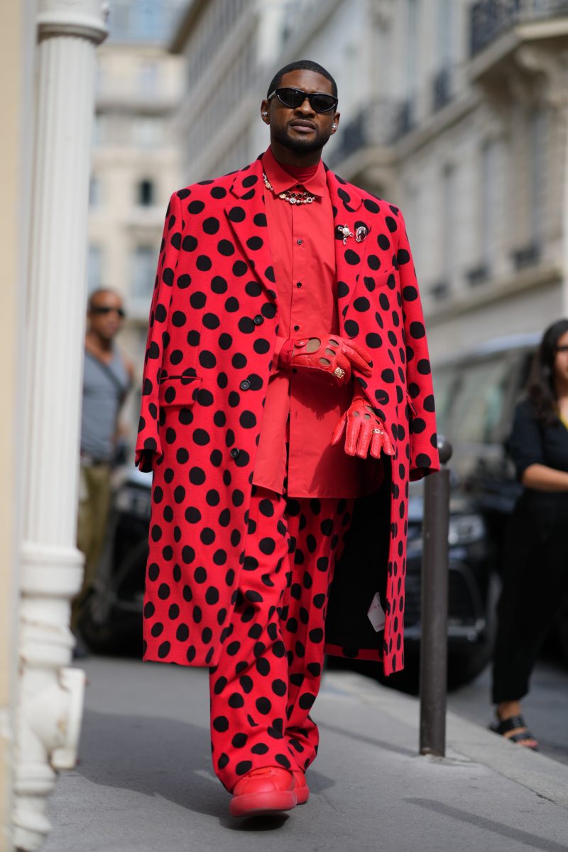 PARIS, FRANCE – SEPTEMBER 27: Usher wears sunglasses, a red oversized shirt, a long red polka dots printed coat, matching wide-leg pants, red leather shoes, gloves, outside Marni, during the Womenswear Spring/Summer 2024 as part of Paris Fashion Week on September 27, 2023 in Paris, France. (Photo by Edward Berthelot/Getty Images)