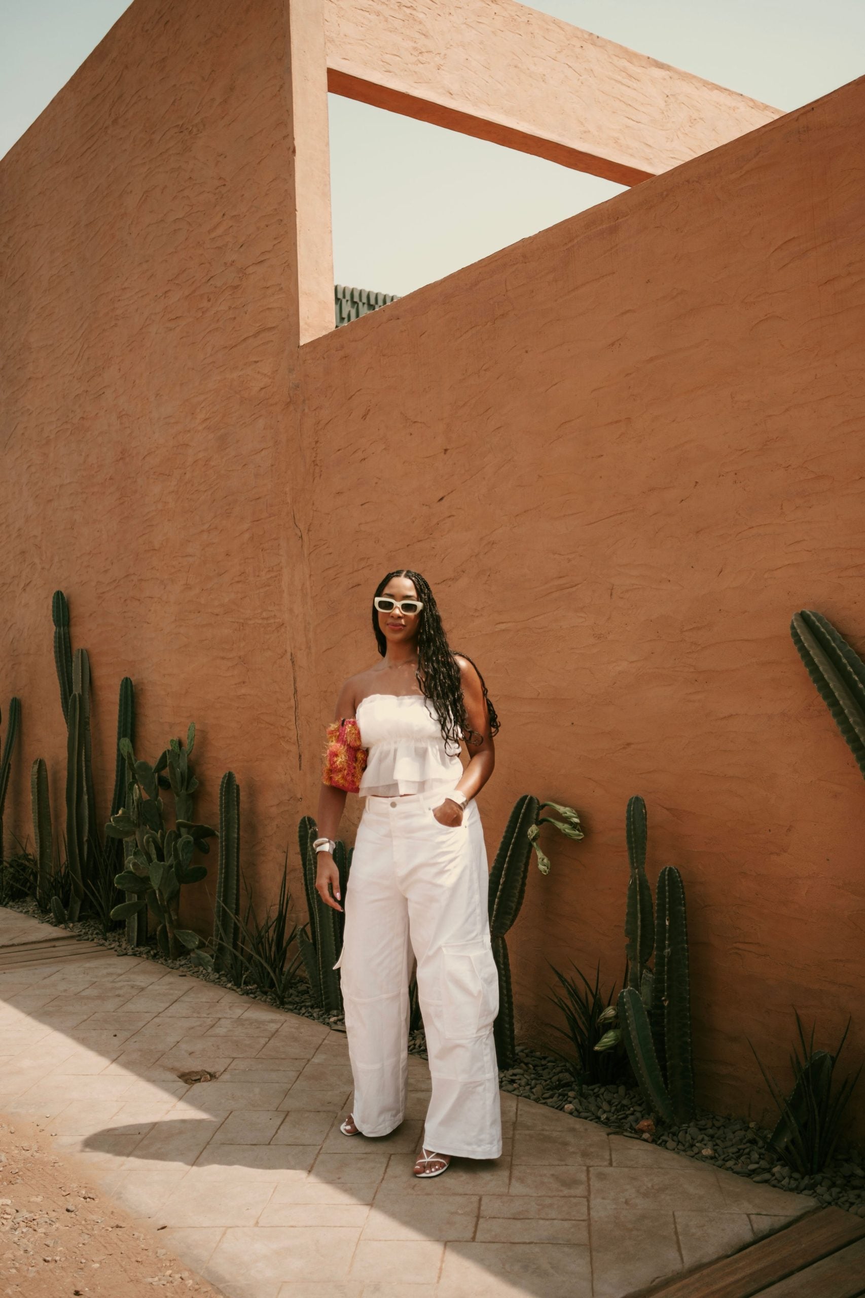 One look was strikingly simple: a cropped tank top and a skirt with gold waist beads and gold shoes to match. Another was a denim-centric outfit worn with a tank top tied at the front, a box-shaped bag, and white sandals.