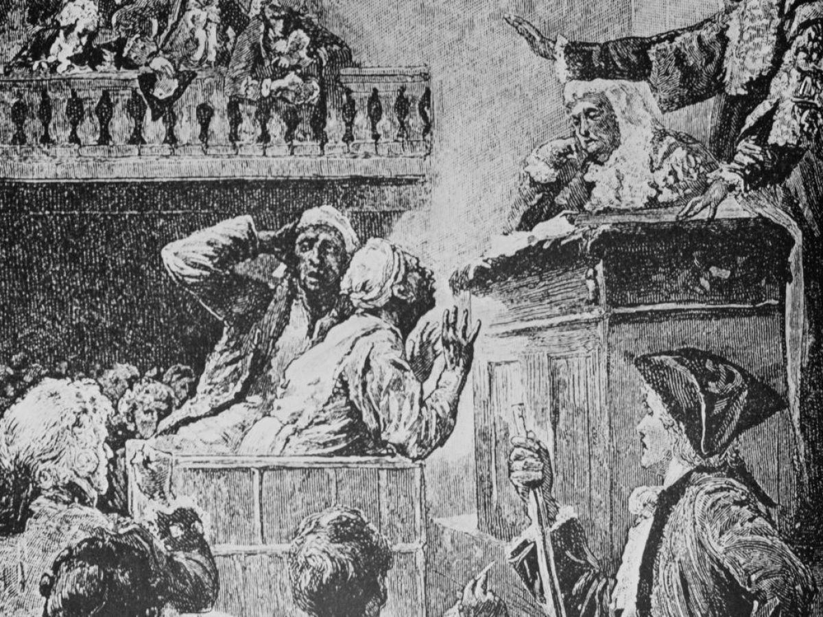 Engraved illustration depicting a man in the dock following claims of a plot by, among others, enslaved people in the British colony of New York to revolt and level New York City with a series of fires, at an court in New York, 1741. In total, 172 people were arrested and tried for conspiracy to level the city, with 34 people executed; illustrator Charles Stanley Reinhart and engraver John William Evans. (Photo by Three Lions/Hulton Archive/Getty Images)