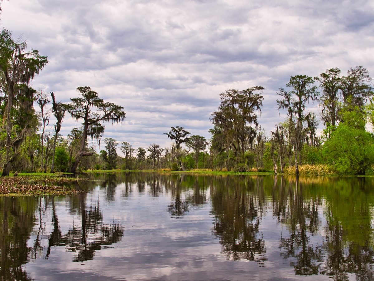 Dramatic skies and crisp reflections in a Louisiana bayou.