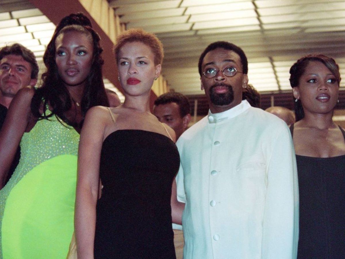US film director Spike Lee (2ndL) poses with his wife Tonya Lewis (C), English model Naomi Campbell (L) and US actress Theresa Randle (R) at the Palais des Festivals, on May 12, 1996 before the showing of their film “Girl 6”, in competition in the 49th International Cannes Film Festival. (Photo by Patrick HERTZOG / AFP) (Photo by PATRICK HERTZOG/AFP via Getty Images)