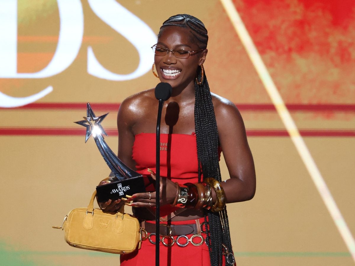 Winner of Best Female Hip Hop Artist US rapper singer Doechii speaks on stage during the 2025 BET Awards at the Peacock Theatre in Los Angeles on June 9, 2025. (Photo by Michael Tran / AFP) (Photo by MICHAEL TRAN/AFP via Getty Images)