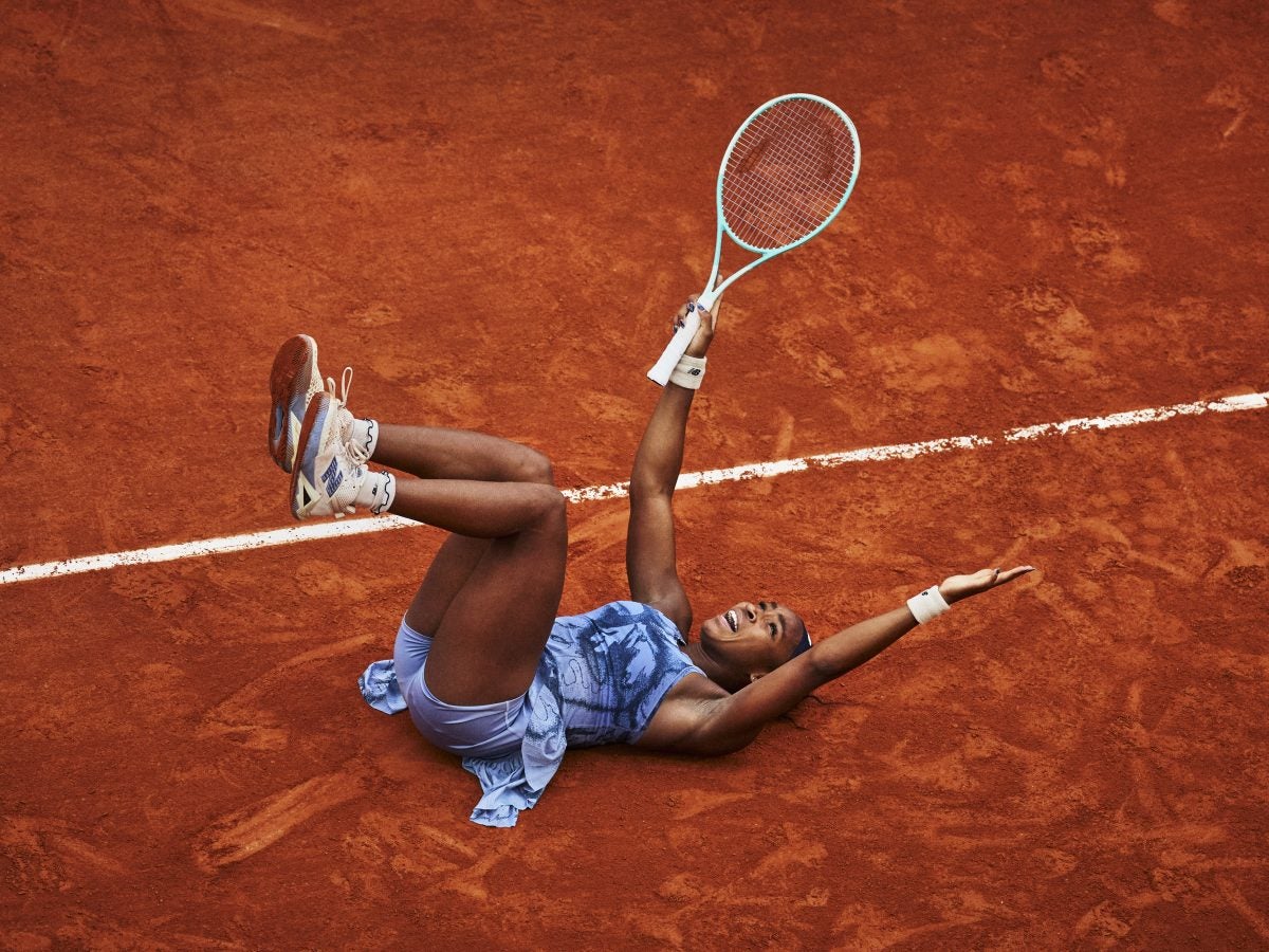 Coco Gauff celebrates her win at the French Open.