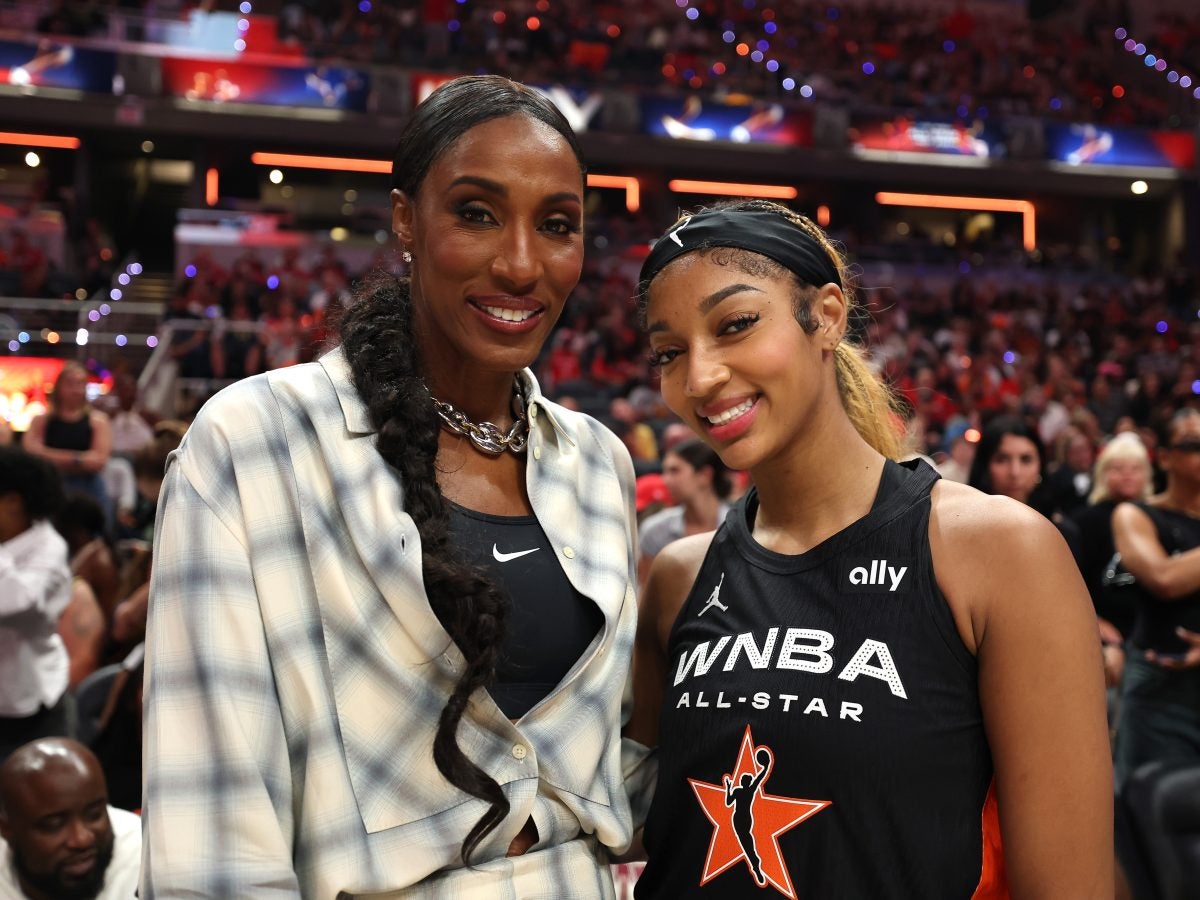 INDIANAPOLIS, INDIANA – JULY 19: (L-R) Former WNBA player Lisa Leslie poses with Angel Reese #5 of the Chicago Sky during the 2025 AT&T WNBA All-Star Game at Gainbridge Fieldhouse on July 19, 2025 in Indianapolis, Indiana. NOTE TO USER: User expressly acknowledges and agrees that, by downloading and or using this photograph, User is consenting to the terms and conditions of the Getty Images License Agreement. (Photo by Steph Chambers/Getty Images)
