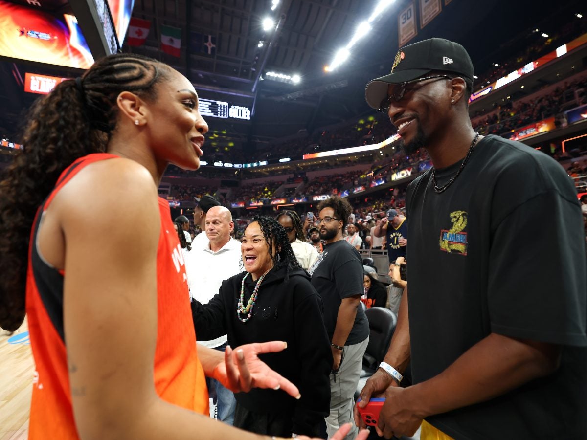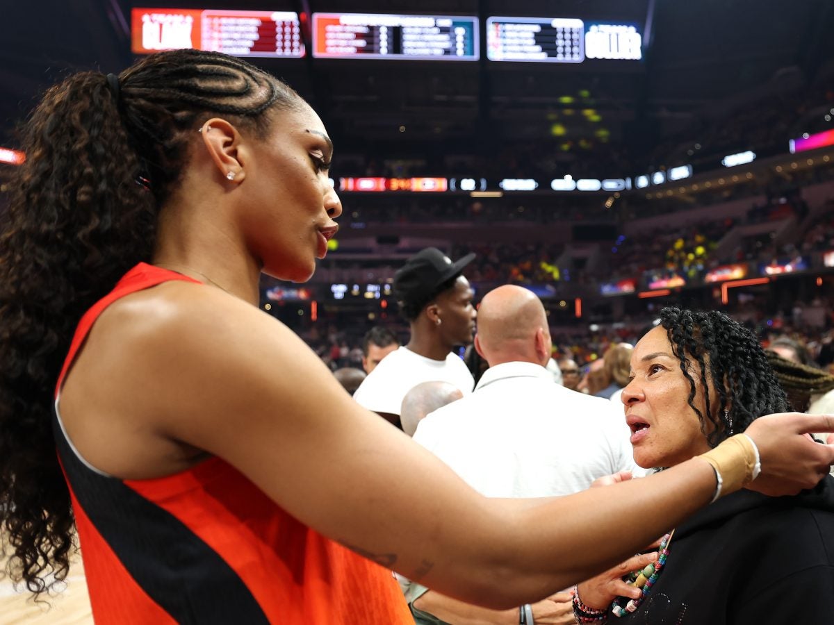 INDIANAPOLIS, INDIANA – JULY 19: A’ja Wilson #22 of the Las Vegas Aces talks with former head coach Dawn Staley of the South Carolina Gamecocks women’s basketball team during the 2025 AT&T WNBA All-Star Game at Gainbridge Fieldhouse on July 19, 2025 in Indianapolis, Indiana. NOTE TO USER: User expressly acknowledges and agrees that, by downloading and or using this photograph, User is consenting to the terms and conditions of the Getty Images License Agreement. (Photo by Steph Chambers/Getty Images)