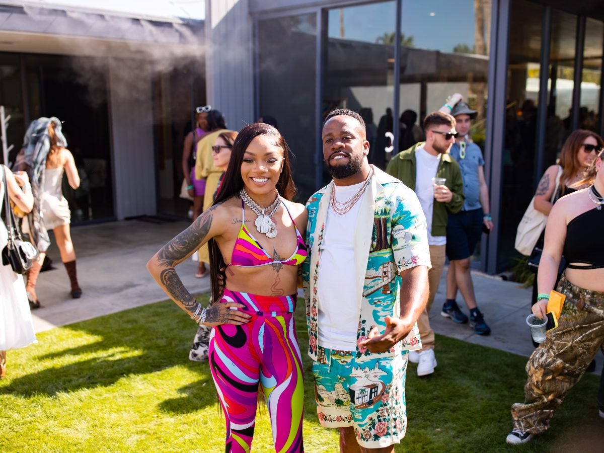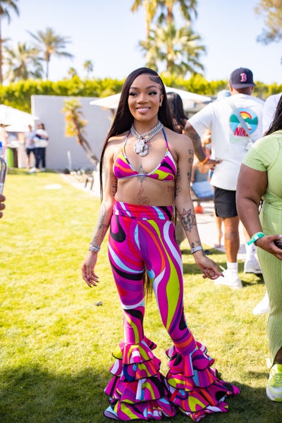 The rapper was seen looking bright and stylish at Interscope’s party over Coachella weekend.