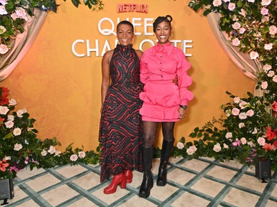 LONDON, ENGLAND – FEBRUARY 14: Adjoa Andoh and Arsema Thomas attend a photocall celebrating the Valentine’s Day Global Teaser Trailer Reveal for “Queen Charlotte: A Bridgerton Story” at Claridge’s Hotel on February 14, 2023 in London, England. (Photo by Dave Benett/Getty Images)