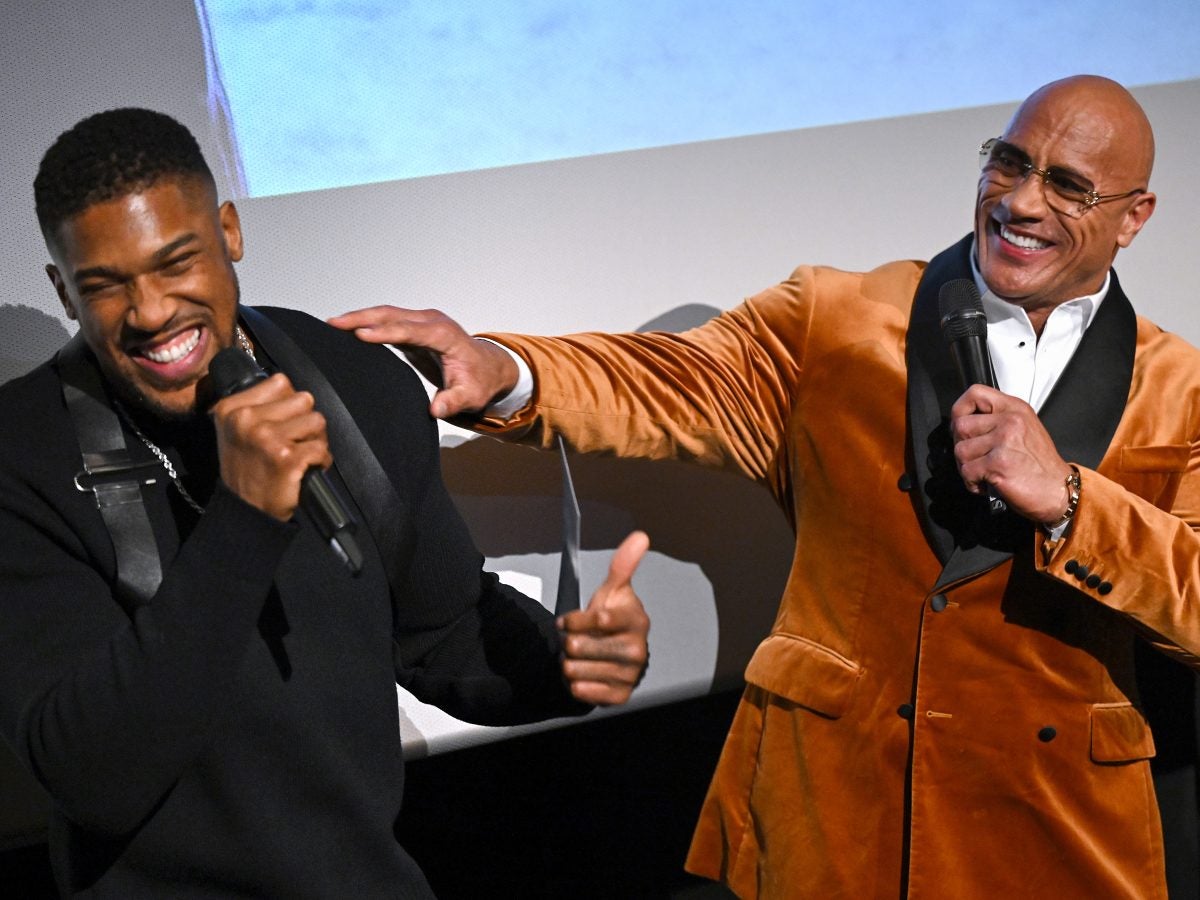 LONDON, ENGLAND – NOVEMBER 06: Dwayne Johnson aka The Rock (R) with two time Heavy Weight Champion Anthony Joshua, who hosted a screening of Red One, with surprise appearance by the cast of the film, at Vue Westfield on November 06, 2024 in London, England. The screening was for Clean Herts Community, a giveback organisation he founded which supports the needs of local families in Watford, Hertfordshire and North London. (Photo by Jeff Spicer/Getty Images for Warner Bros. Pictures)