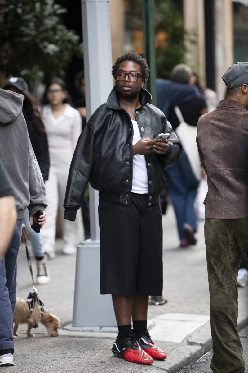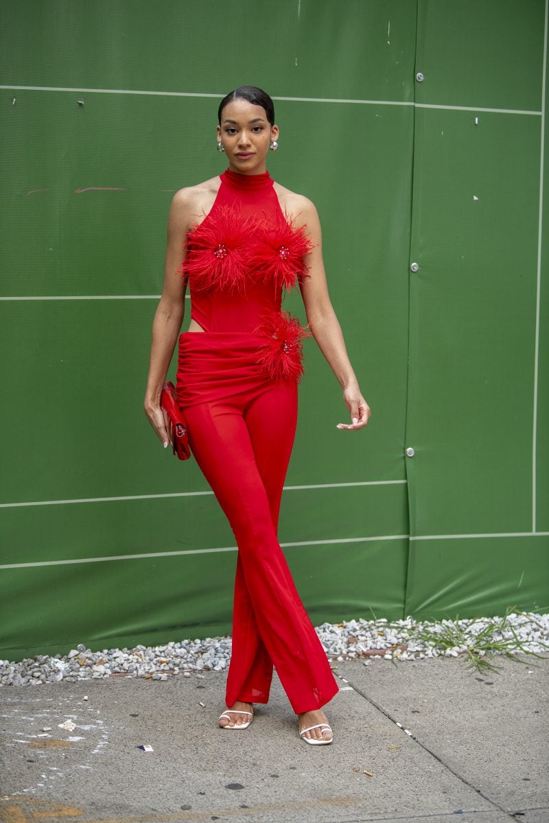 One of our favorite creative directors, June Ambrose, wore her signature tall hat, which she’s known for donning with a tan skirt set and a matching oversized vest. Another attendee also wore a similar shaped hat, pairing it with a denim jacket and loose, loose pleared trousers. Additionally, a guest on his way to a show was spotted wearing a gray structured suit with a pair of glossy black leather shoes. He accessorized with black tinted sunglasses and a navy blue baseball cap. Lastly, pops of color were seen on a guest wearing an all-red outfit, consisting of a form-fitting dress and a baseball cap in the same hue.