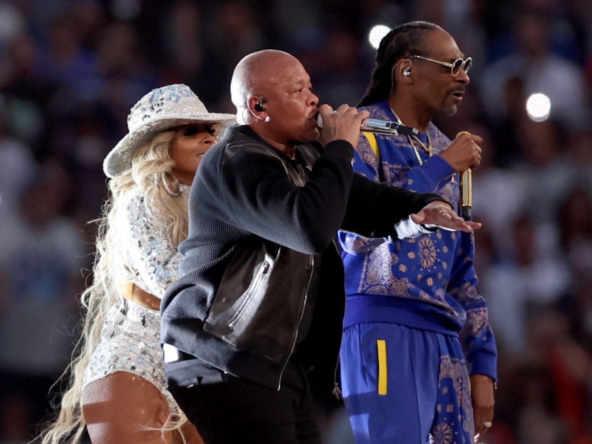 INGLEWOOD, CALIFORNIA – FEBRUARY 13: Dr. Dre performs alongside Mary J. Mary J. Blige and Snoop Dogg during the Pepsi Super Bowl LVI Halftime Show at SoFi Stadium on February 13, 2022 in Inglewood, California. (Photo by Rob Carr/Getty Images)