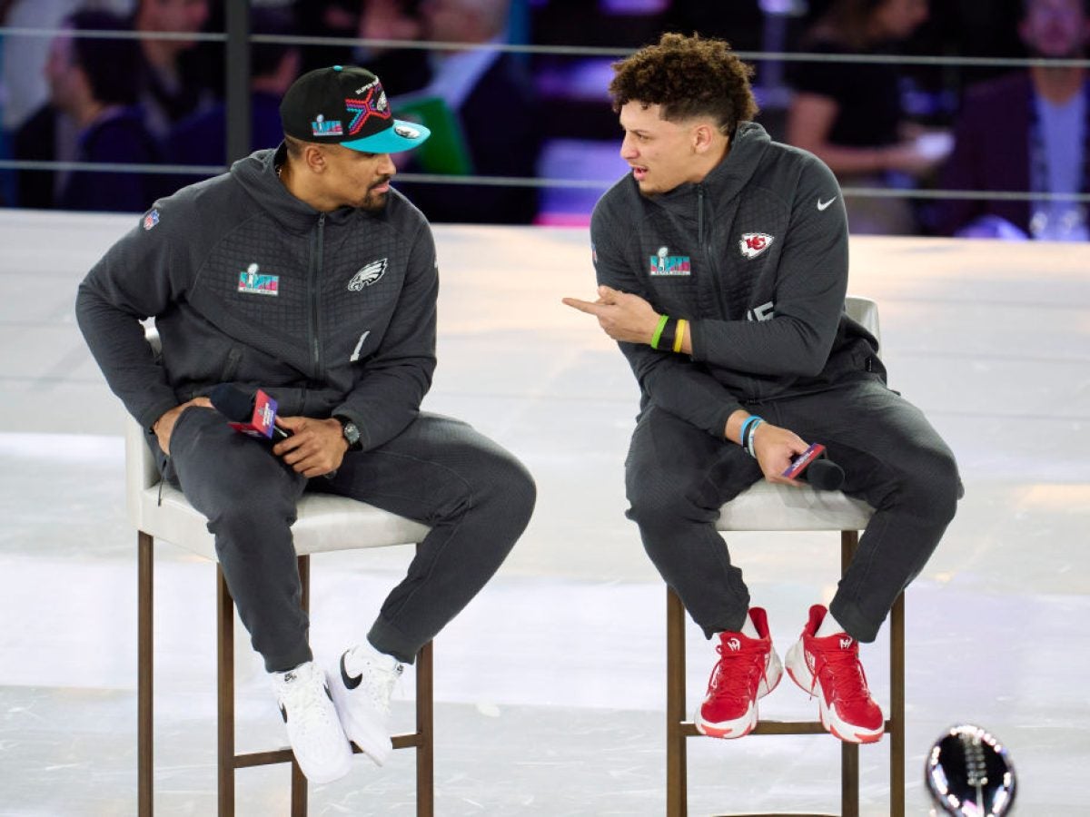 PHOENIX, AZ – FEBRUARY 06: Jalen Hurts #1 of the Philadelphia Eagles speaks with Patrick Mahomes #15 of the Kansas City Chiefs at Footprint Center on February 6, 2023 in Phoenix, Arizona. (Photo by Cooper Neill/Getty Images)