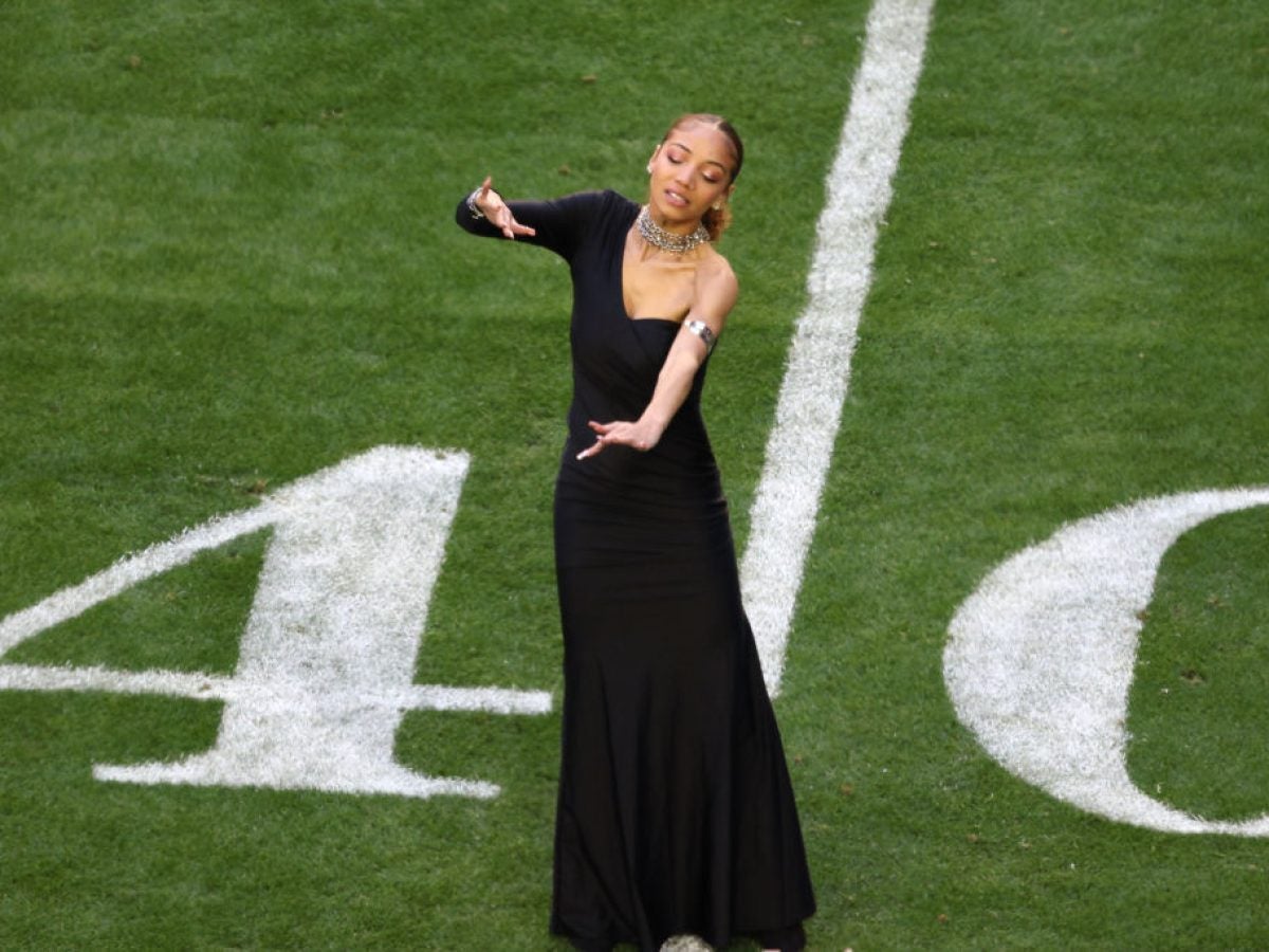 GLENDALE, ARIZONA – FEBRUARY 12: Justina Miles performs “Lift Every Voice and Sing” in American Sign Language prior to Super Bowl LVII between the Kansas City Chiefs and Philadelphia Eagles at State Farm Stadium on February 12, 2023 in Glendale, Arizona. (Photo by Rob Carr/Getty Images)