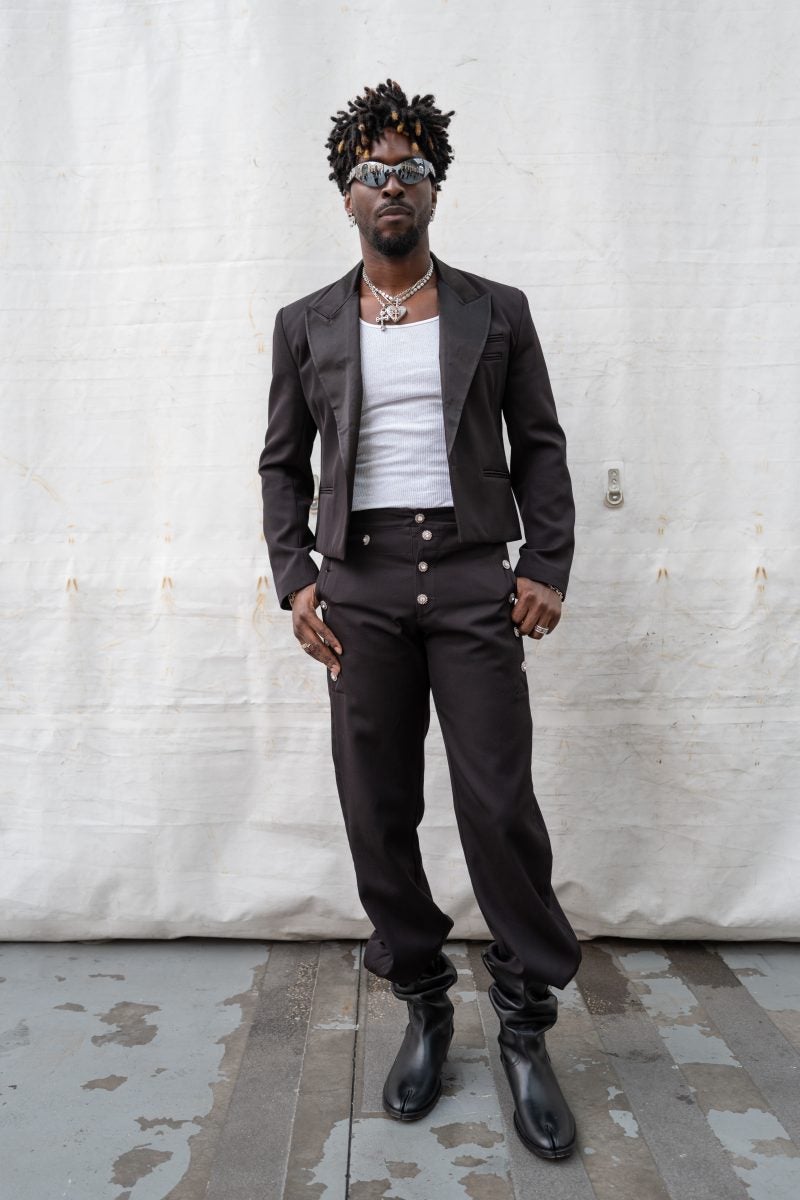 Stefon Diggs showed up to the Rick Owens show wearing a white leather structured jacket and contrasting zipped pants in light grey. As a whole, this look was a brilliant display of how he experiments even outside of his tunnel outfits. In another shot, Aleali May donned an oversized black leather coat and a pair of sleek black trousers. The zippered detailing on her pants was downright striking. Her style moment was head-turning.