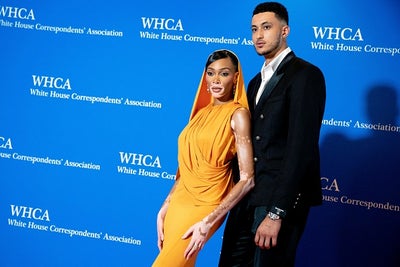 Canadian model Winnie Harlow (L) and US basketball player Kyle Kuzma arrive for the White House Correspondents’ Association dinner at the Washington Hilton in Washington, DC, April 29, 2023. (Photo by Stefani Reynolds / AFP) (Photo by STEFANI REYNOLDS/AFP via Getty Images)