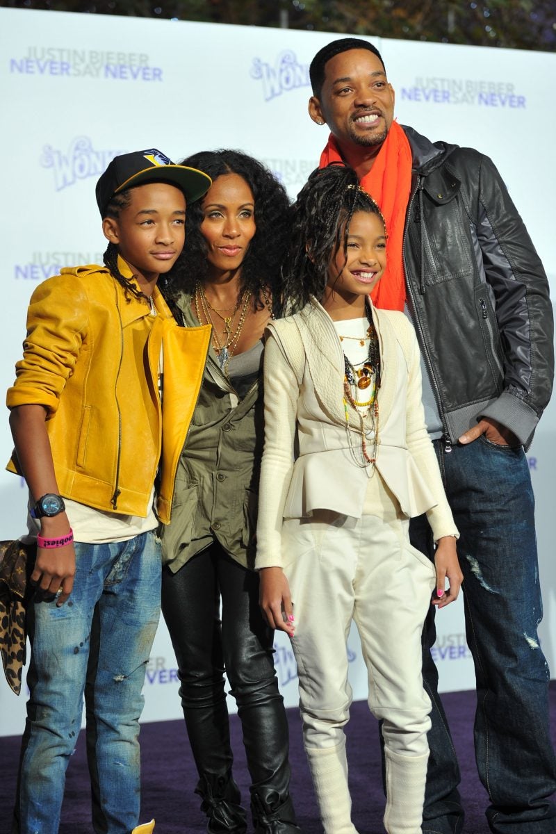 LOS ANGELES, CA – FEBRUARY 08: (L-R) Actor Jaden Smith, singer Willow Smith, actors Will Smith, and Jada Pinkett Smith arrive at the premiere of Paramount Pictures’ “Justin Bieber: Never Say Never” held at Nokia Theater L.A. Live on February 8, 2011 in Los Angeles, California. (Photo by Alberto E. Rodriguez/Getty Images for Paramount Pictures)