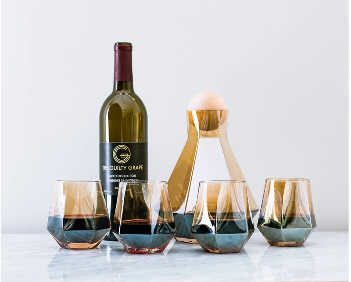 Twins Nichelle and Nicole are here to disrupt the wine industry with their focused, visionary brand. They want to party and celebrate with you, starting with wine. They source their wines from some of the best micro-vineyards in California. The twins want to specifically speak to those wine lovers that have been ignored by the industry. Their Cabernet and Peach Mango Bubbly are to sigh for. They also offer gorgeous accoutrements, including this decanter and stemless geometric glass set. The Guilty Grape Decanter & Amber Diamond Wine Glass Set