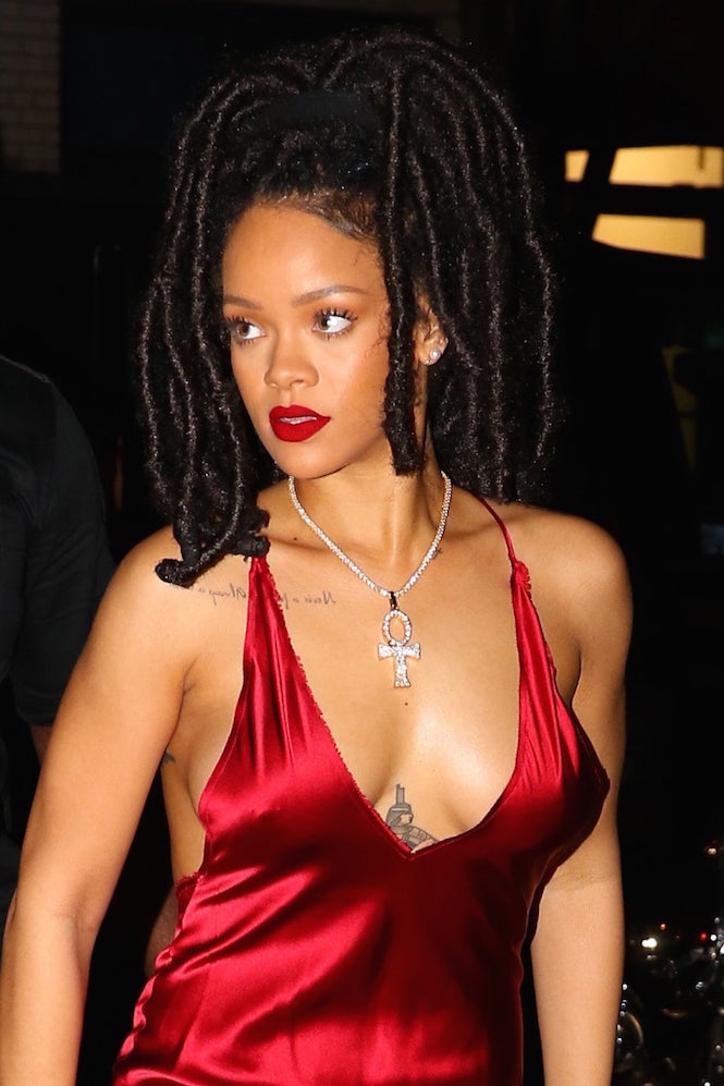 Ravishing and red hot, Rihanna steps out for dinner in this slinky frock and faux locs.