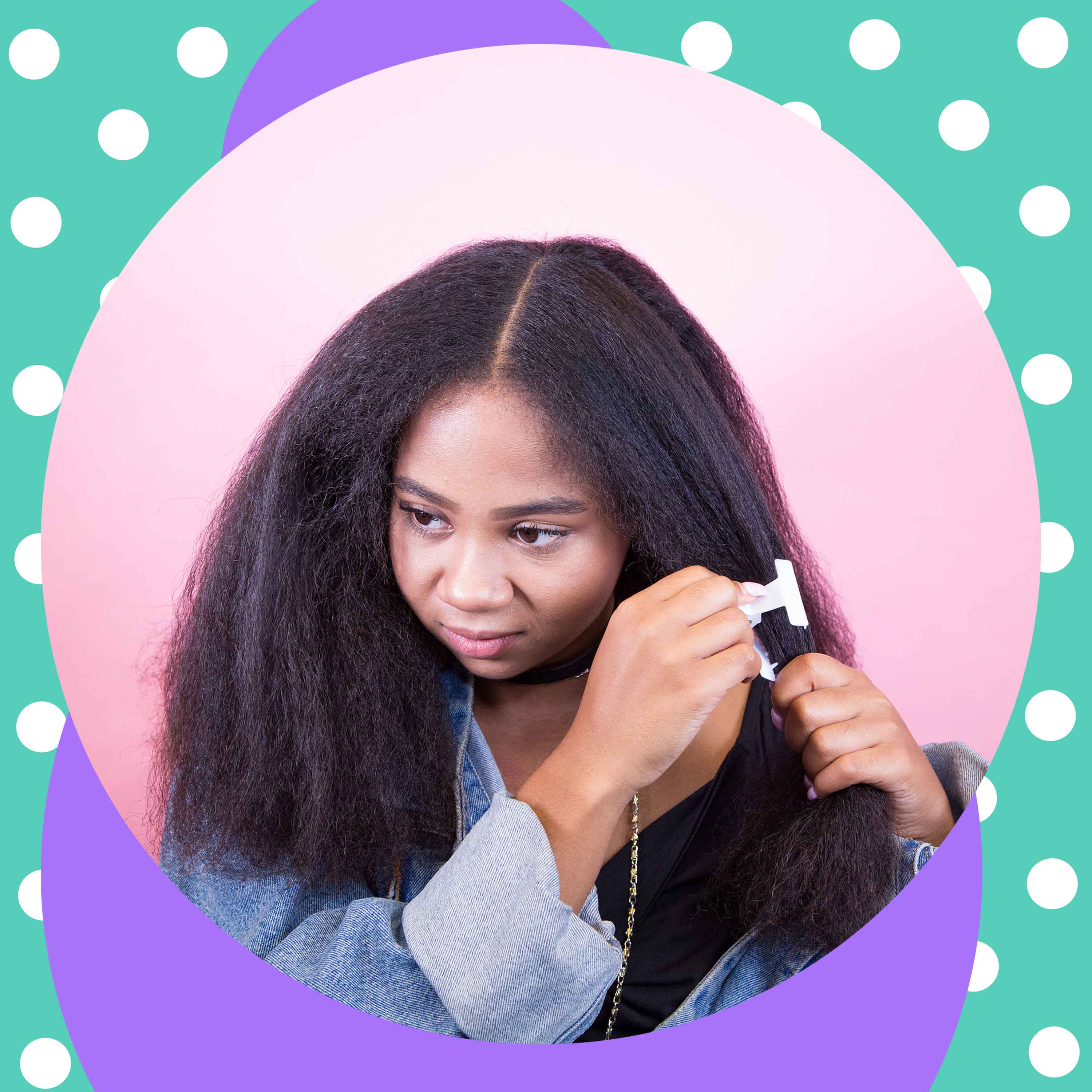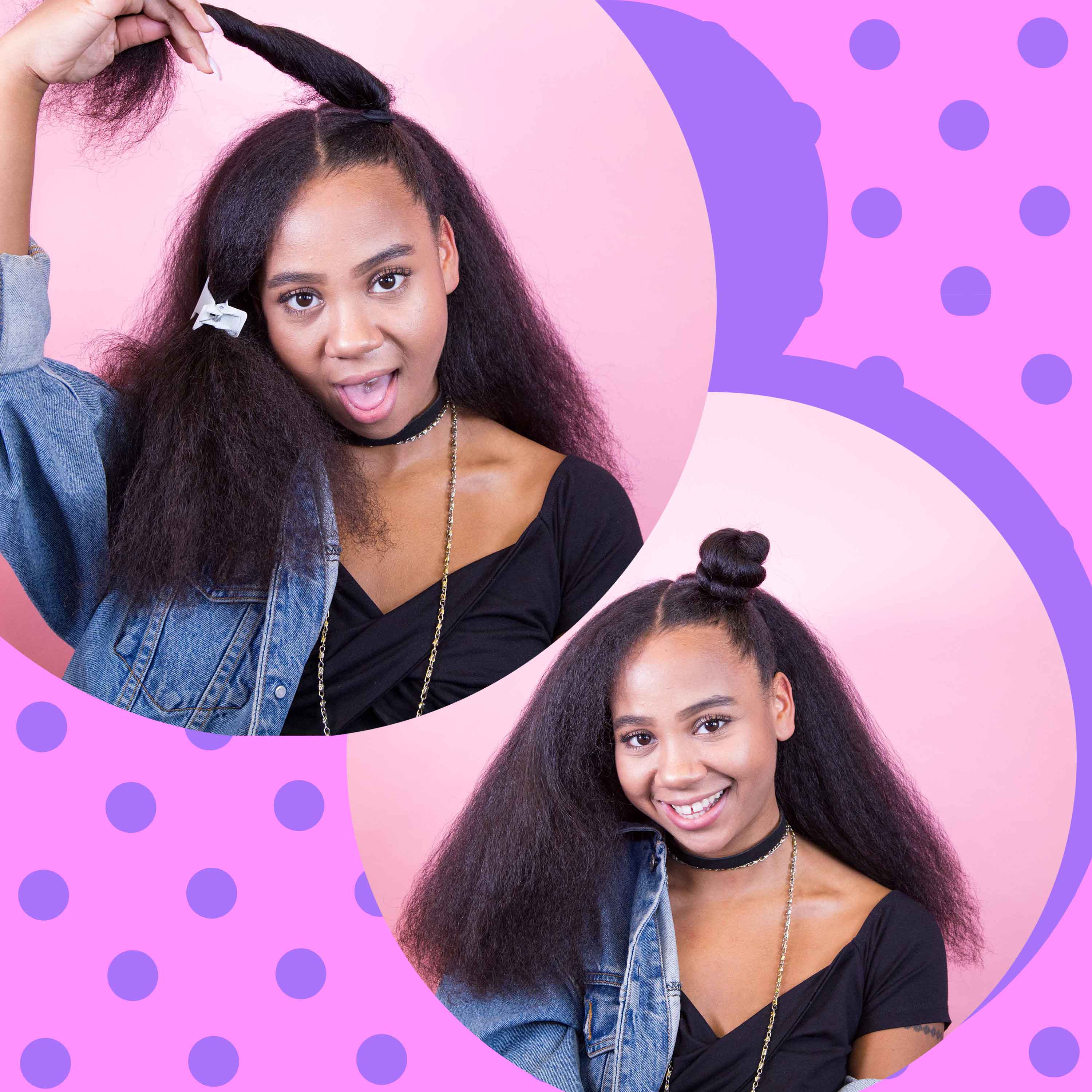 First, we’re showing you how to create a half-up, half-down style that incorporates bantu knots. As with any style, be sure to weatherproof your ‘do with a humidity-resistant product.
