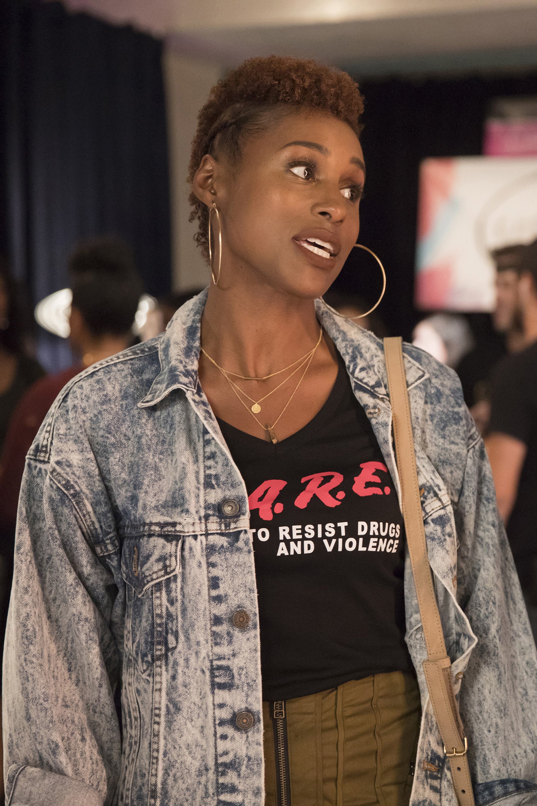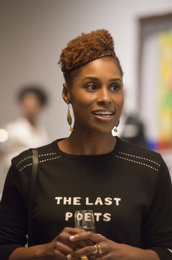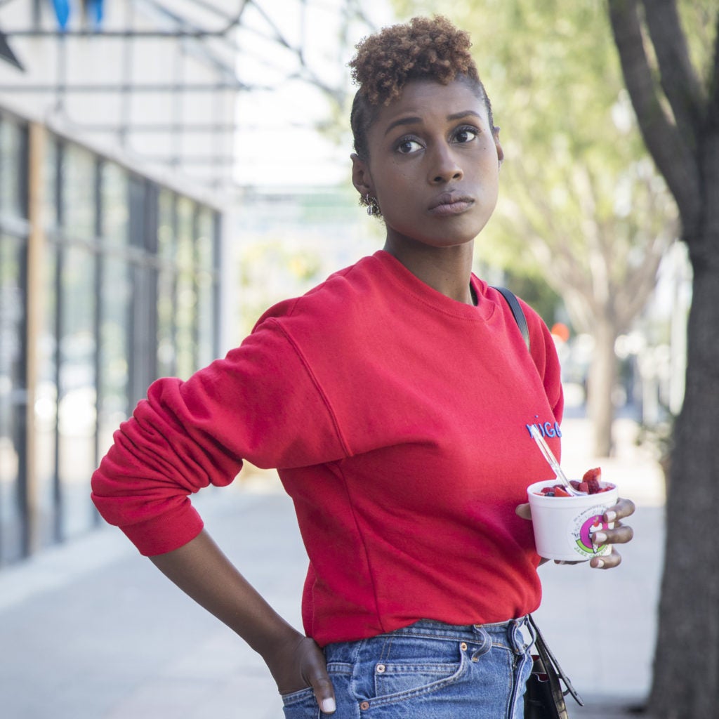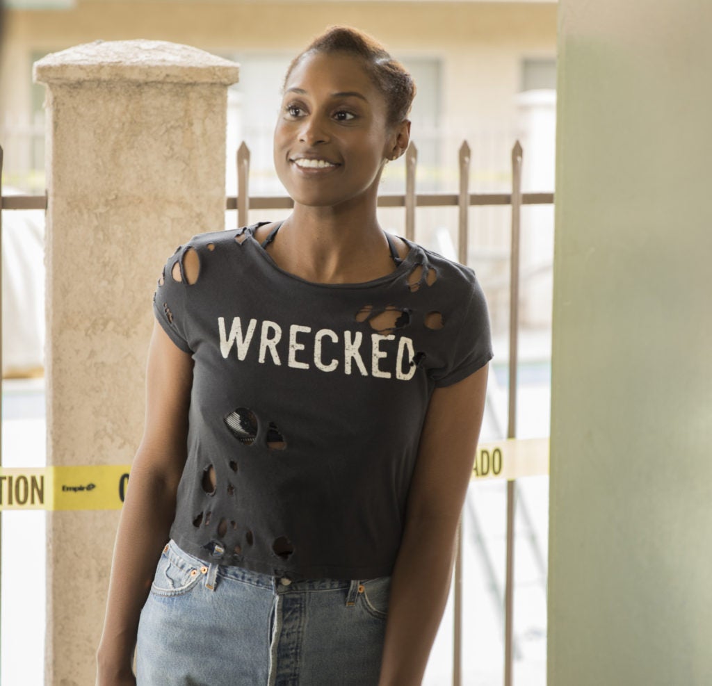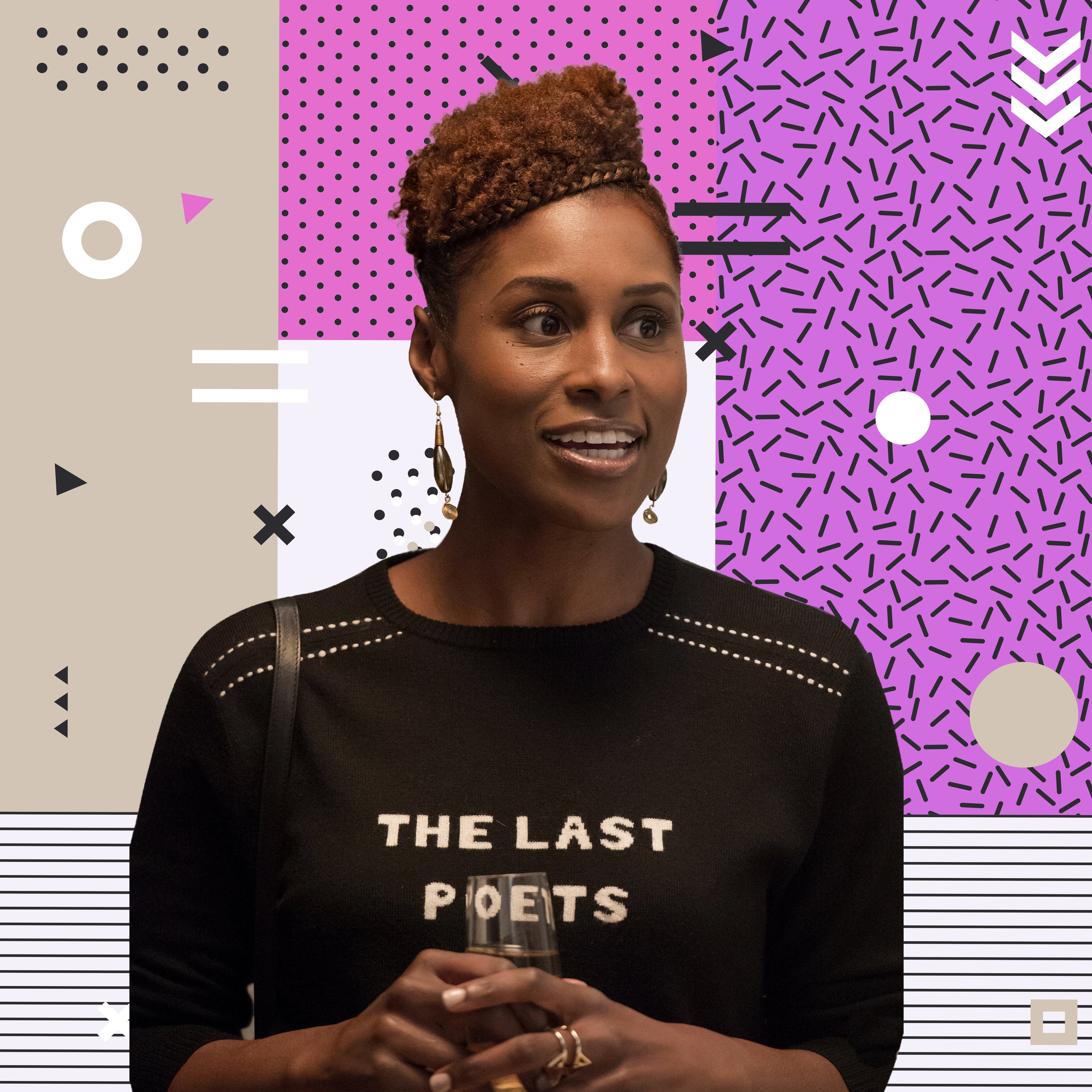 Issa’s fro is pulled back with two side swept cornrows, giving a halo of texture.