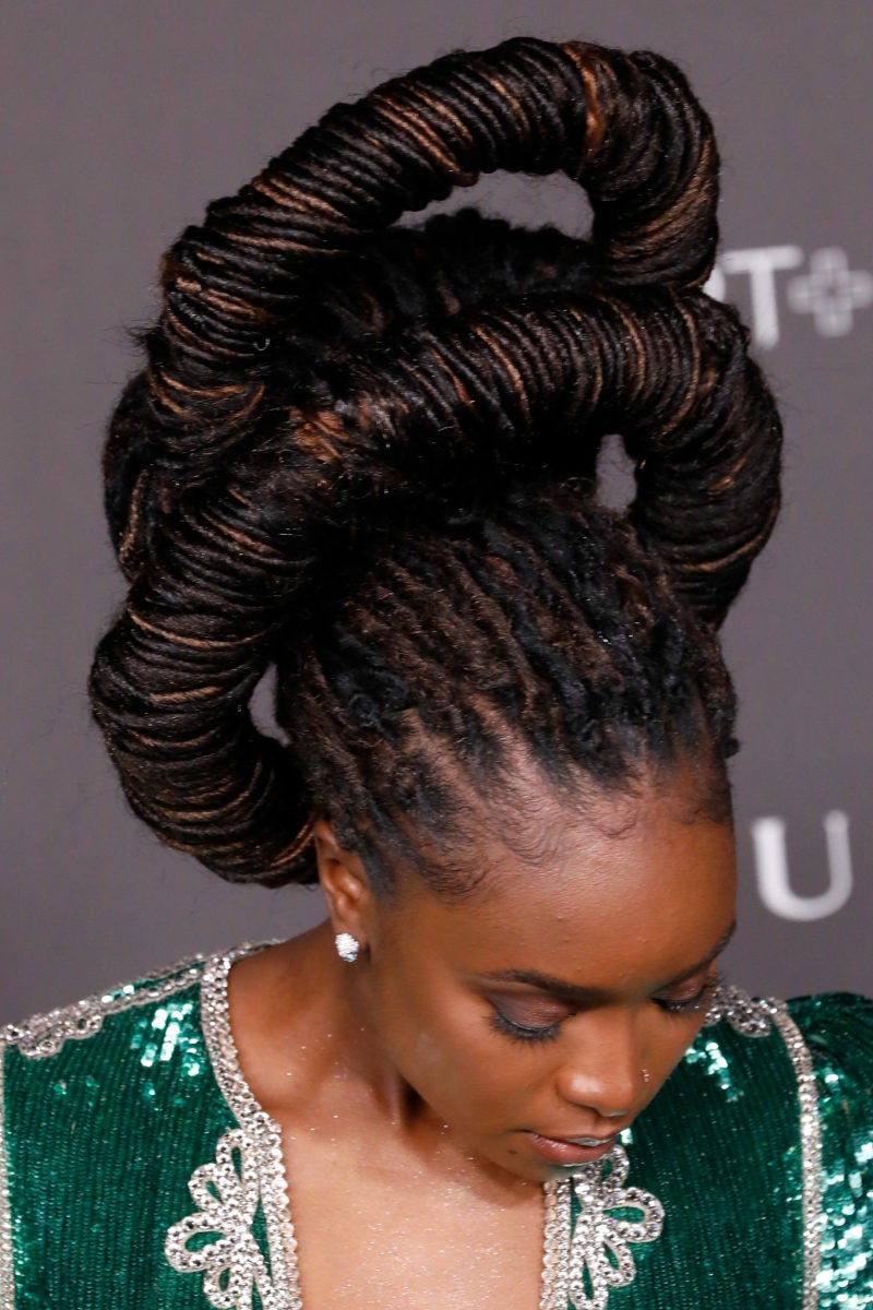 Blessed by the treasured hands of celebrity hairstylist Larry J. Sims, the If Beale Street Could Talk star donned a structural ‘do that stood out as a highlight of the evening. Made up of mixed colored faux locs, her updo sort of looked like a planet with two rings orbiting around it.