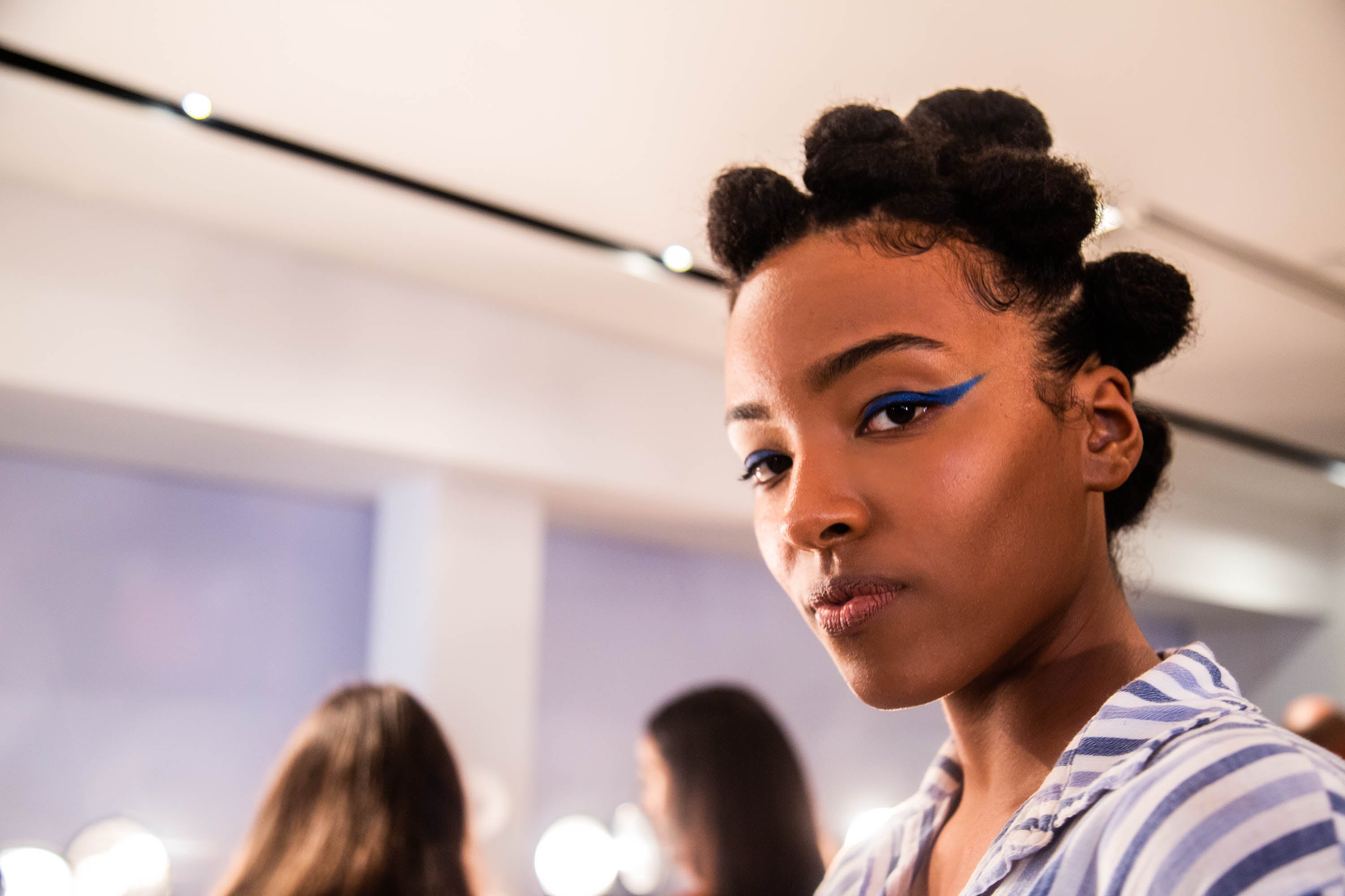 A model shows off her luminous skin and back of her curly ‘fro backstage.